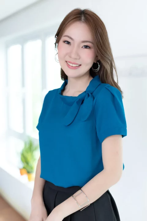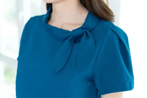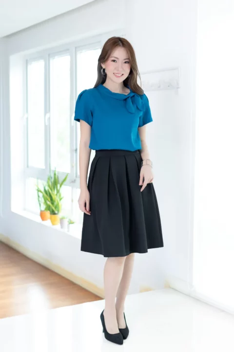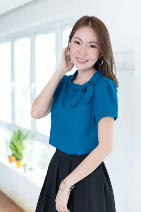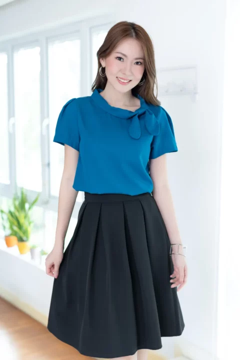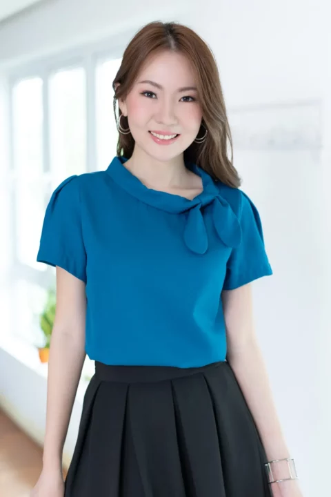 เสื้อคอกลมแต่งขอบคอม้วน มีกิมมิคน่ารักเป็นโบว์สอดจากชายสองฝั่งของปก แขนสั้นจับจีบต้นแขน ผ้าโฟร์เวย์ ไม่บางมากแต่ไม่หนาไป มีความเป็นทรงมากกว่าอิตาลีเล็กน้อย รุ่นนี้เป็นแบบสวมไม่มีผ่าหยดน้ำด้านหลังนะคะ