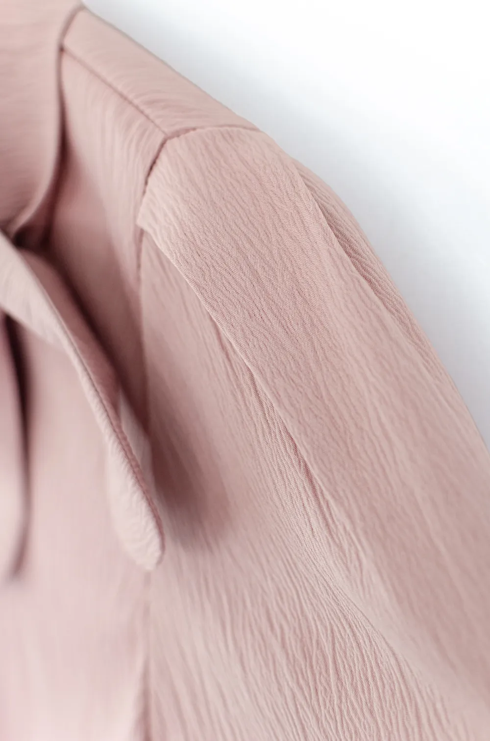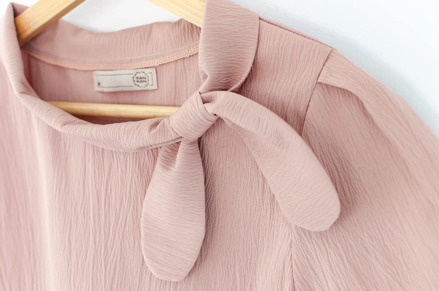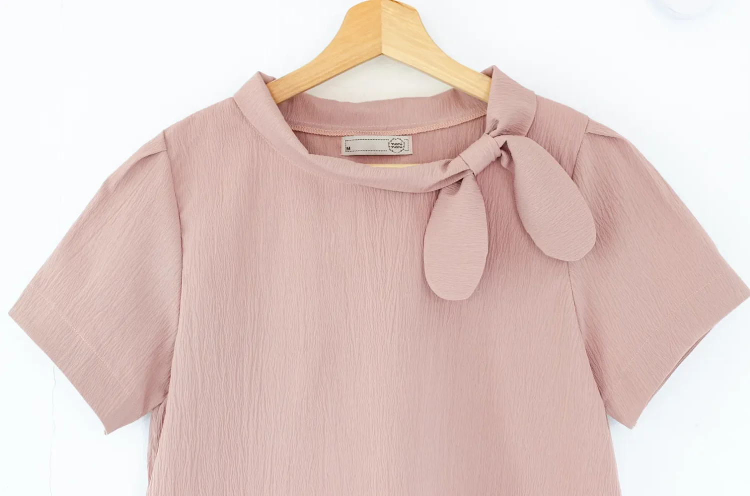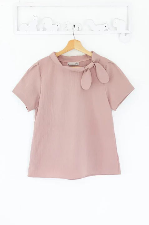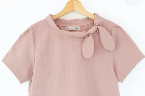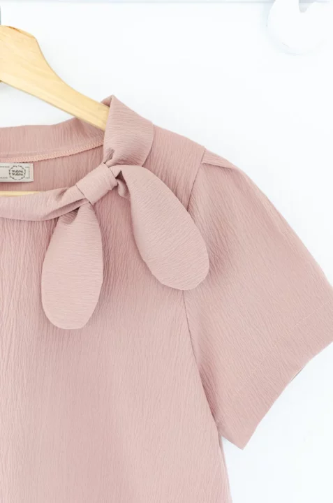 เสื้อคอกลมแต่งขอบคอม้วน มีกิมมิคน่ารักเป็นโบว์สอดจากชายสองฝั่งของปก แขนสั้นจับจีบต้นแขน ผ้าเนื้อย่น รุ่นนี้เป็นแบบสวมไม่มีผ่าหยดน้ำด้านหลัง
