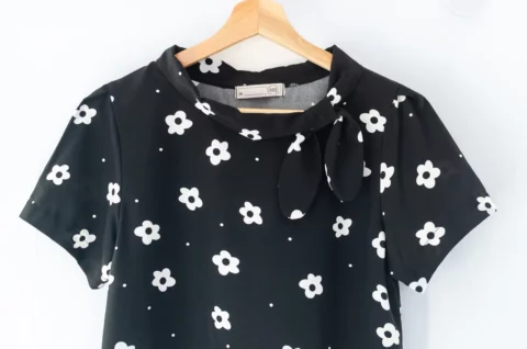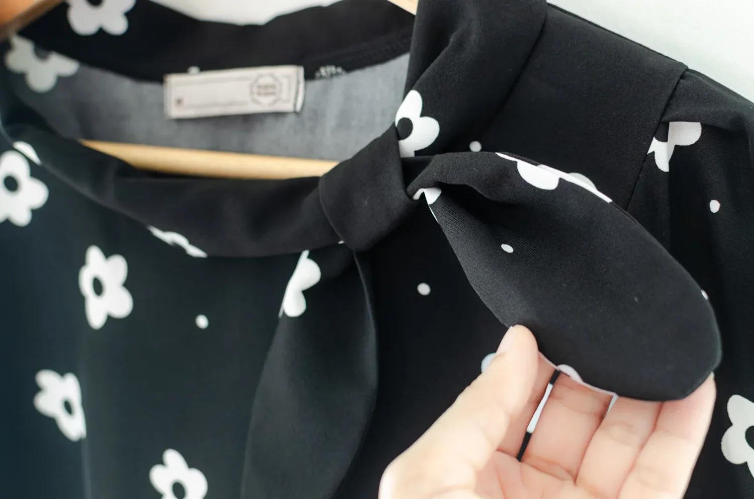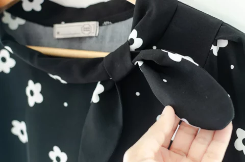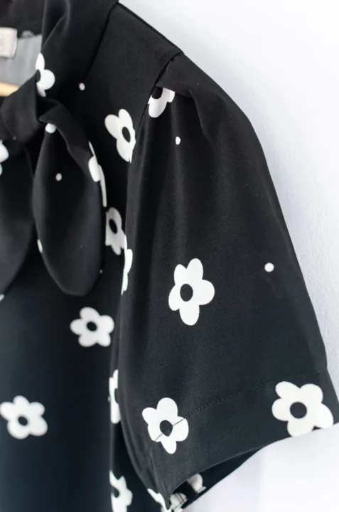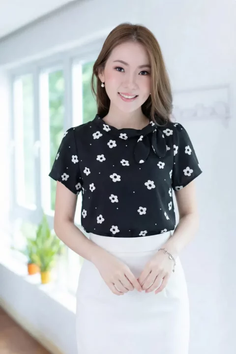 เสื้อคอกลมแต่งขอบคอม้วน มีกิมมิคน่ารักเป็นโบว์สอดจากชายสองฝั่งของปก แขนสั้นจับจีบต้นแขน ผ้าเนื้อเนียน ผิวเรียบ รุ่นนี้เป็นแบบสวมไม่มีผ่าหยดน้ำด้านหลัง** รอบคอเสื้อแคบ แนะนำให้วัดรอบศีรษะเพิ่ม **