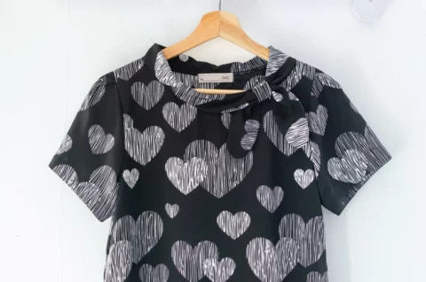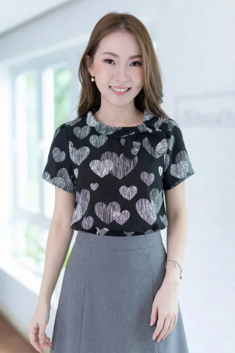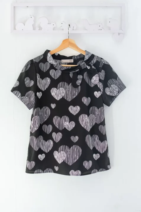 เสื้อคอกลมแต่งขอบคอม้วน มีกิมมิคน่ารักเป็นโบว์สอดจากชายสองฝั่งของปก แขนสั้นจับจีบต้นแขน ผ้าเนื้อเนียน ผิวเรียบ รุ่นนี้เป็นแบบสวมไม่มีผ่าหยดน้ำด้านหลัง** รอบคอเสื้อแคบ แนะนำให้วัดรอบศีรษะเพิ่ม **