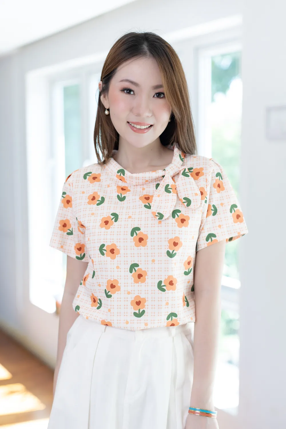 เสื้อคอกลมแต่งขอบคอม้วน มีกิมมิคน่ารักเป็นโบว์สอดจากชายสองฝั่งของปก แขนสั้นจับจีบต้นแขน ผ้าเนื้อย่น ลายพิมพ์ดอกไม้บนลายตารางน่ารักสดใส รุ่นนี้เป็นแบบสวมไม่มีผ่าหยดน้ำด้านหลัง