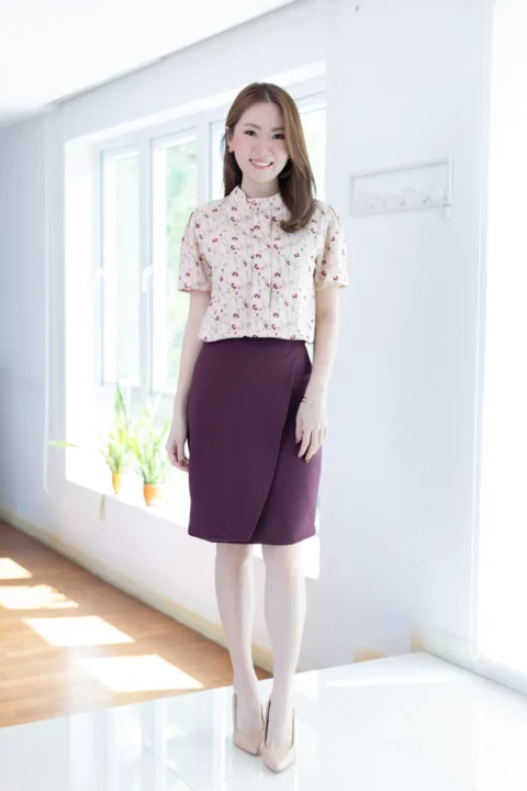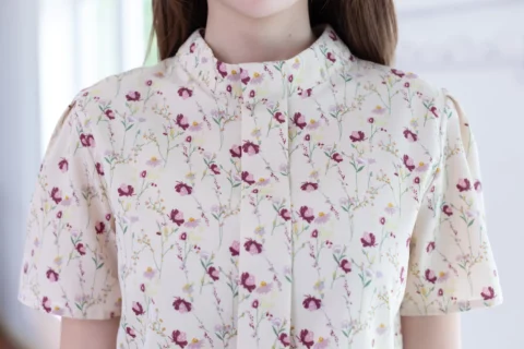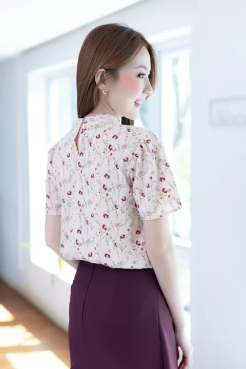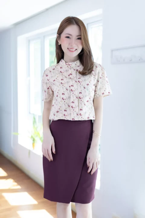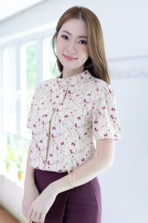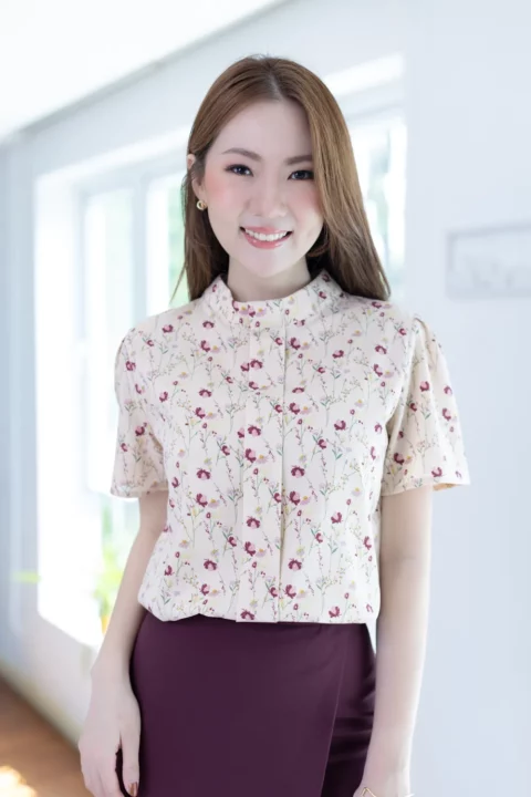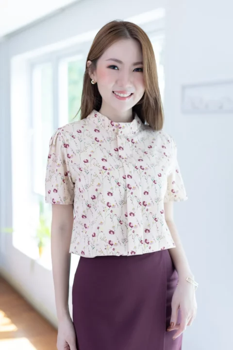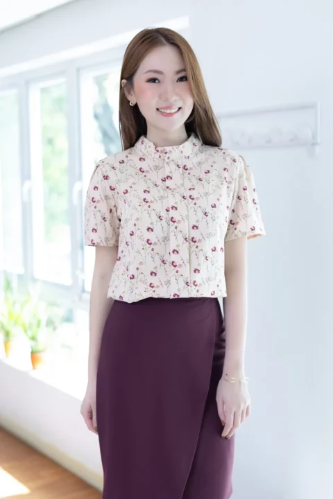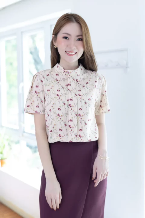 เสื้อคอปิดแต่งสาบหลอกด้านหน้ายาว ทรงแขนสั้นจับจีบหัวไหล่ ตัดเย็บด้วยผ้าไหมอิตาลีลายดอกไม้ ได้ลุคที่ดูหวานขึ้นกว่าสีพื้น แนะนำสำหรับวันที่อยากดูหวานและแอบเก๋ค่า รุ่นนี้ผ่าหยดน้ำติดกระดุมด้านหลัง สวมใส่ง่ายไม่ติดศรีษะ