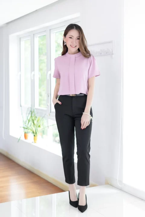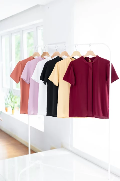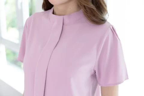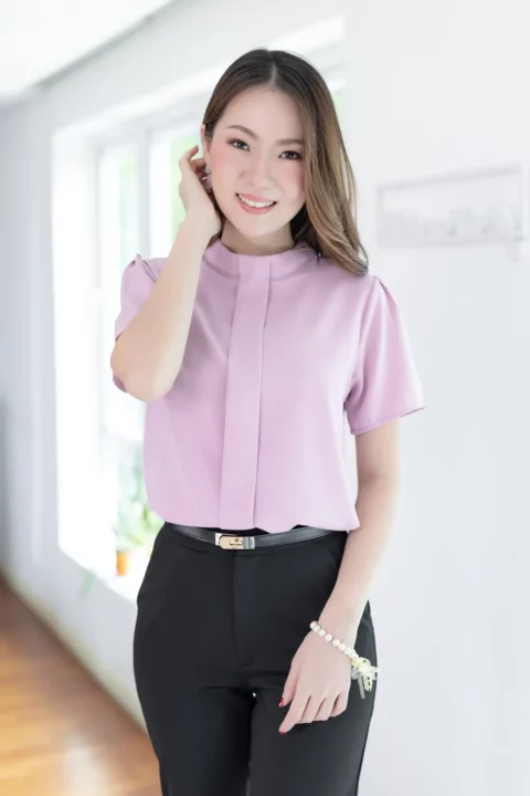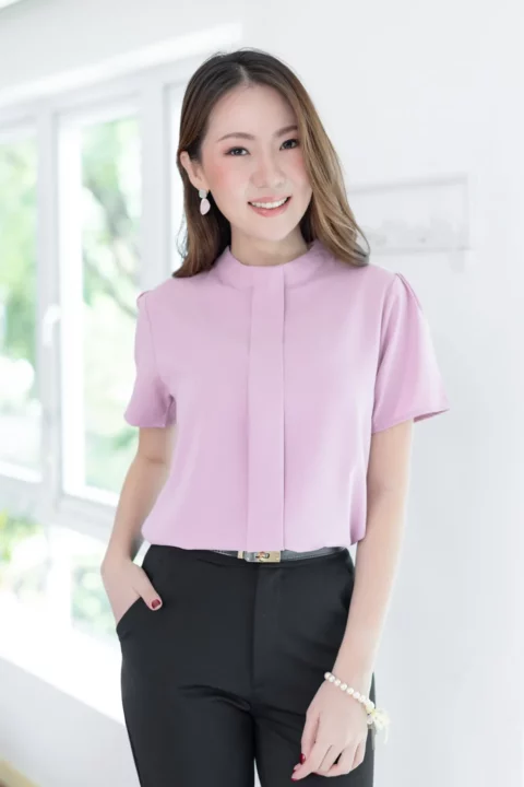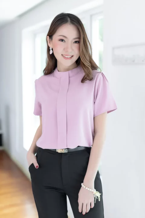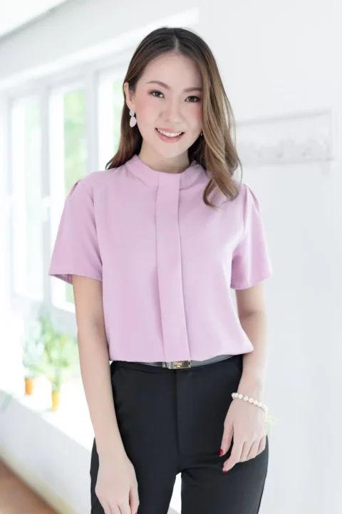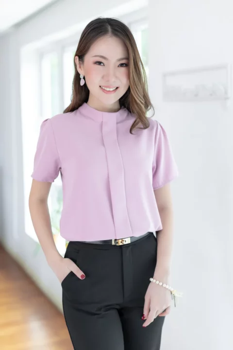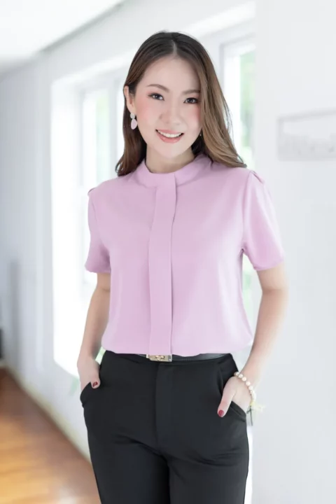 เสื้อคอปิดแต่งสาบหลอกด้านหน้ายาวๆ ทรงแขนสั้นจับจีบหัวไหล่ ตัดเย็บด้วยผ้าโพลีเอสเตอร์ผสมเนื้อพรีเมี่ยม ผ้าเนียนลื่นทิ้งตัวสวย ผ่าหยดน้ำ ติดกระดุมด้านหลัง สวมใส่ง่ายไม่ติดศรีษะ