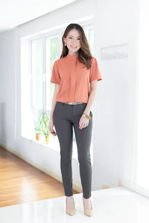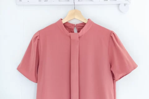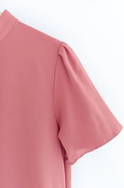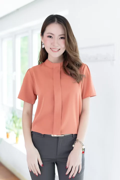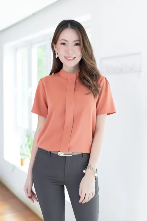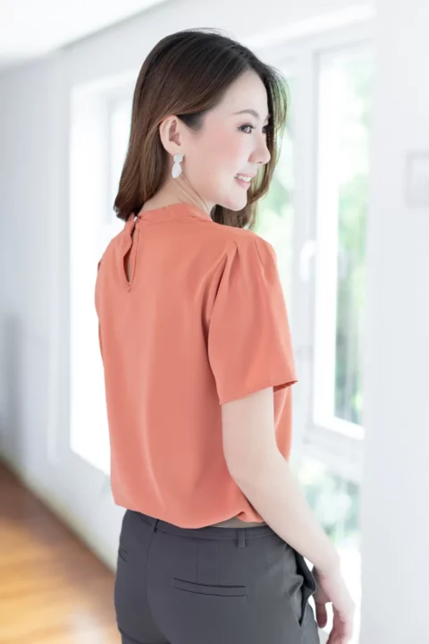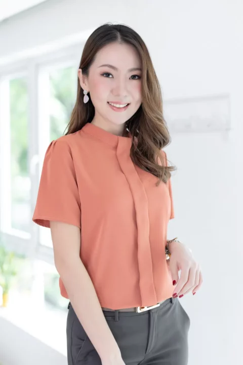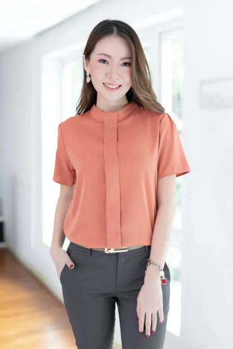 เสื้อคอปิดแต่งสาบหลอกด้านหน้ายาวๆ ทรงแขนสั้นจับจีบหัวไหล่ ตัดเย็บด้วยผ้าโพลีเอสเตอร์ผสมเนื้อพรีเมี่ยม ผ้าเนียนลื่นทิ้งตัวสวย ผ่าหยดน้ำ ติดกระดุมด้านหลัง สวมใส่ง่ายไม่ติดศรีษะ