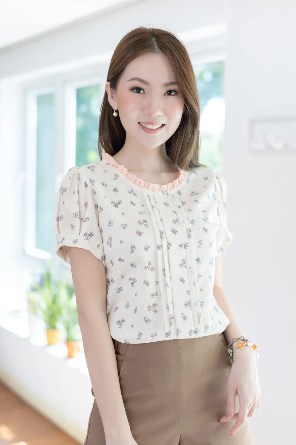 เสื้อทำงานลุคเรียบร้อยพูดน้อย เนื้อผ้าพิมพ์ลายดอกไม้ คอกลม แต่งระบายสั้นรอบคอด้วยผ้าสีตัดกับตัวเสื้อ แต่งดีเทลเกล็ดยาวด้านหน้า แขนสั้นจับจีบทรงพองนิดๆ ทรงเสื้อเป็นแบบสวม ไม่มีผ่าหยดน้ำหลัง