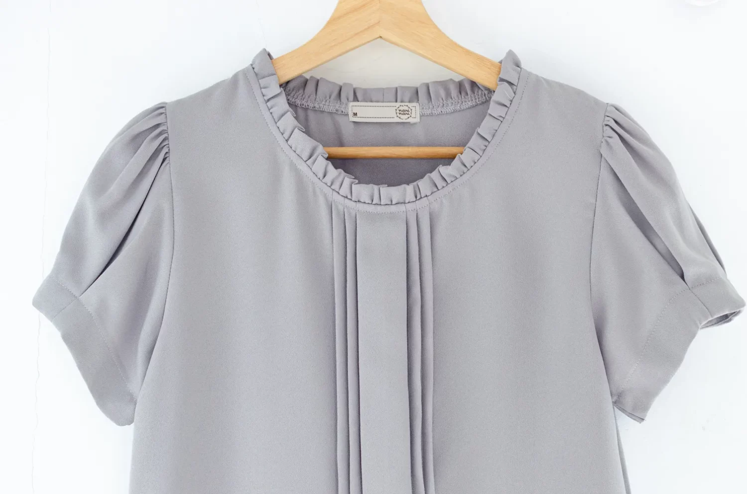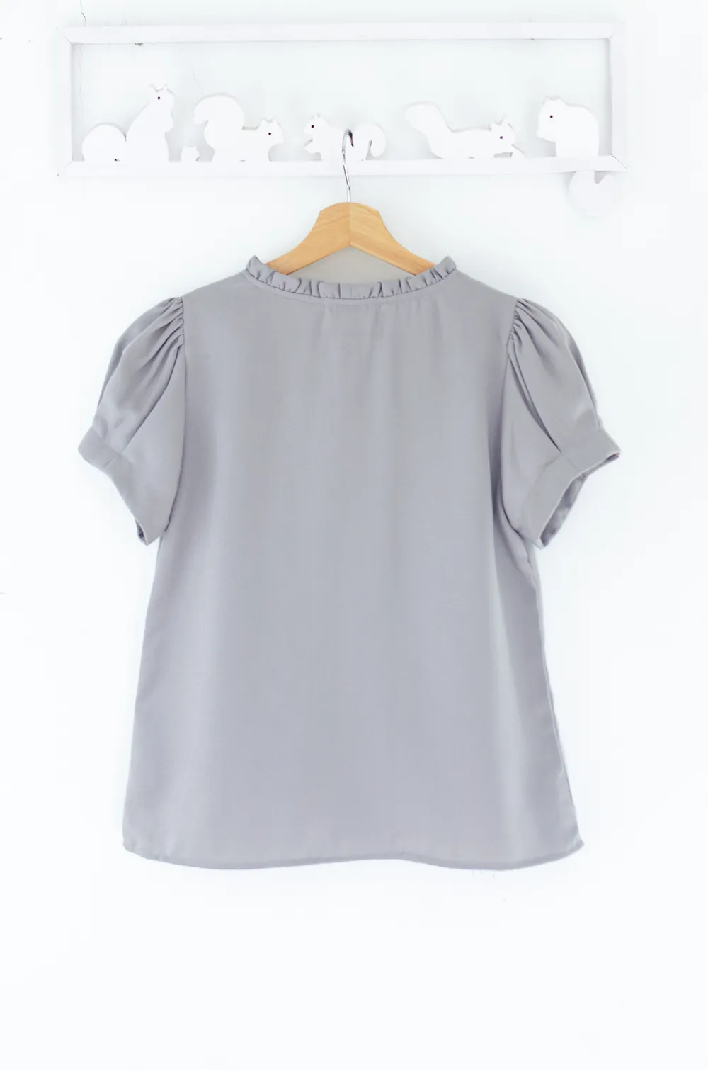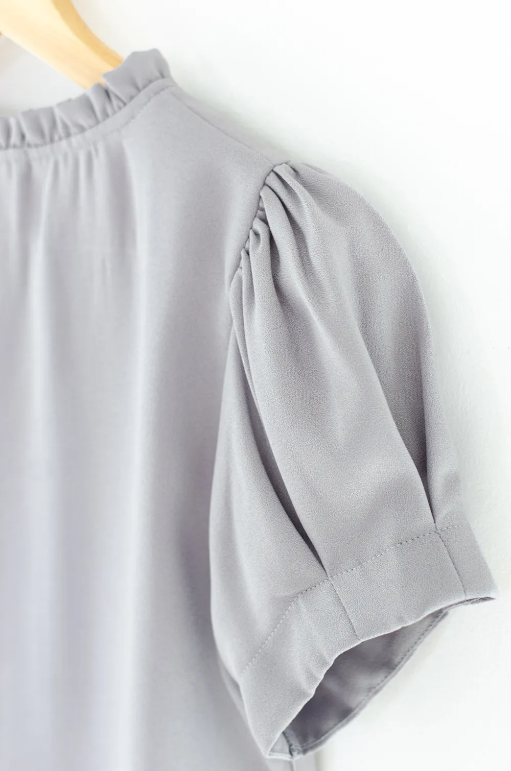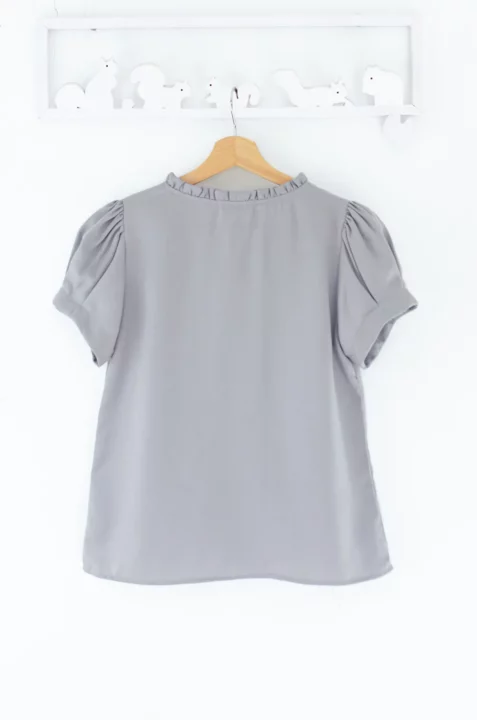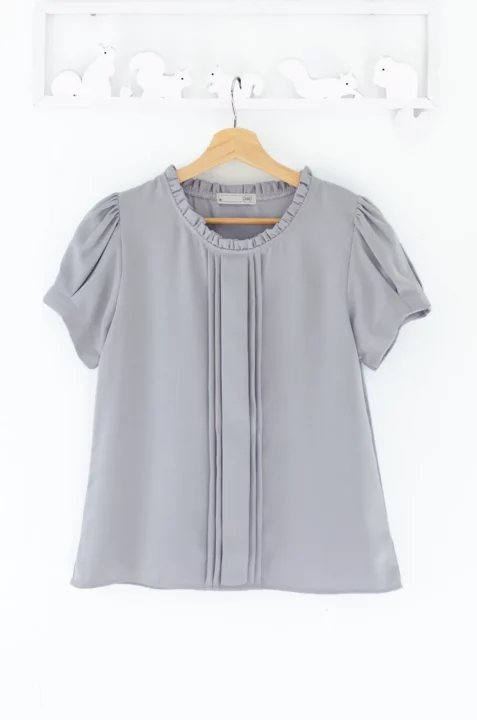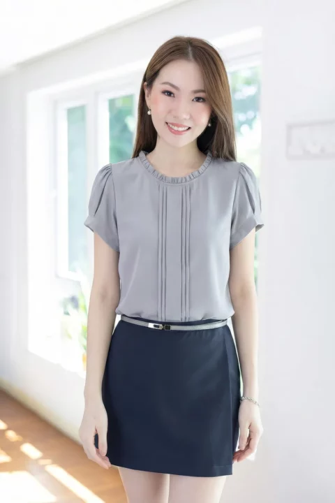 เสื้อทำงานลุคเรียบร้อยพูดน้อย เนื้อผ้าพิมพ์ลาย คอกลม แต่งระบายสั้นรอบคอ มีดีเทลเกล็ดยาวด้านหน้า แขนสั้นจับจีบทรงพองนิดๆ ทรงเสื้อเป็นแบบสวม ไม่มีผ่าหยดน้ำหลัง