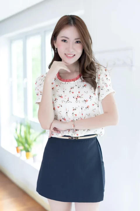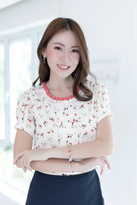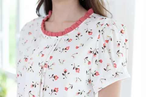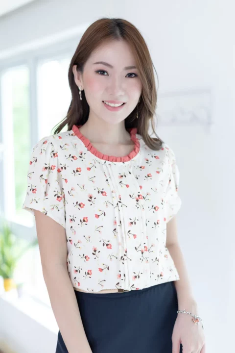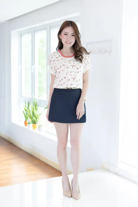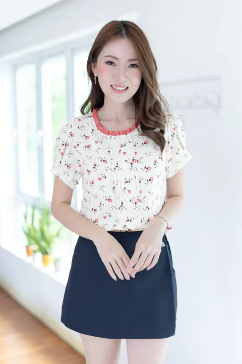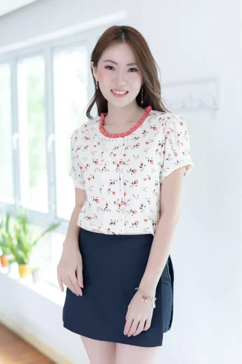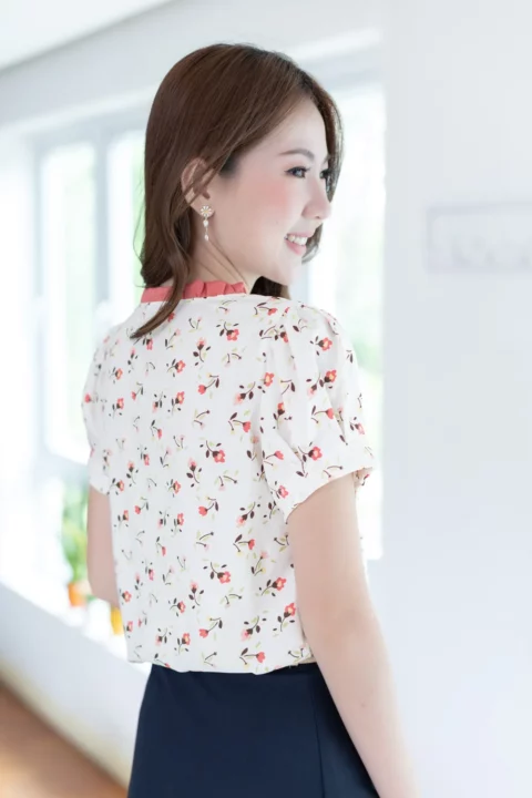 เสื้อทำงานลุคเรียบร้อยพูดน้อย เนื้อผ้าพิมพ์ลายดอกไม้ คอกลม แต่งระบายสั้นรอบคอด้วยผ้าสีตัดกับตัวเสื้อ แต่งดีเทลเกล็ดยาวด้านหน้า แขนสั้นจับจีบทรงพองนิดๆ ทรงเสื้อเป็นแบบสวม ไม่มีผ่าหยดน้ำหลัง