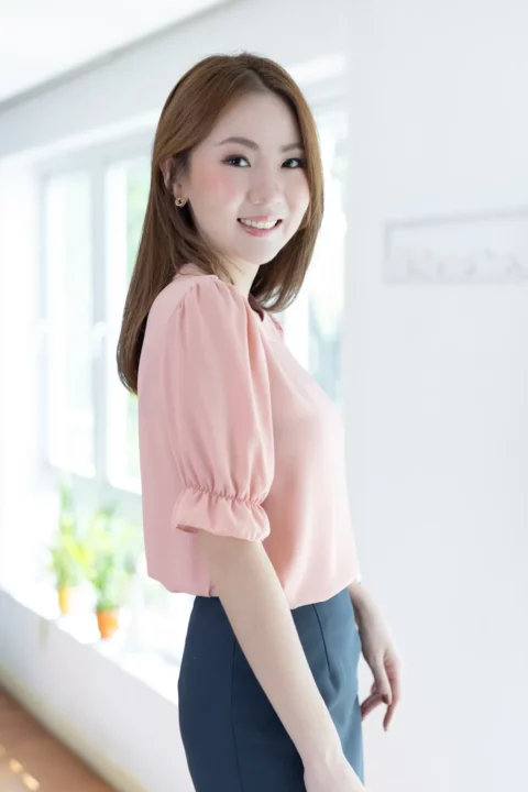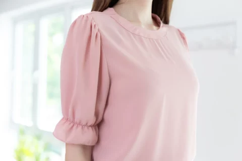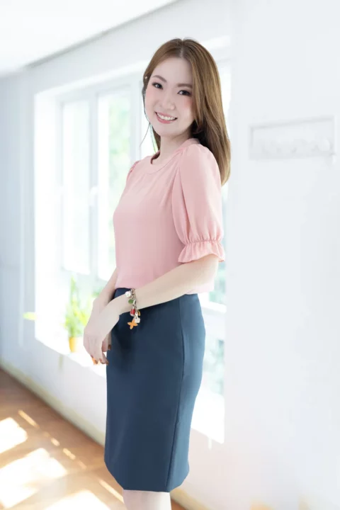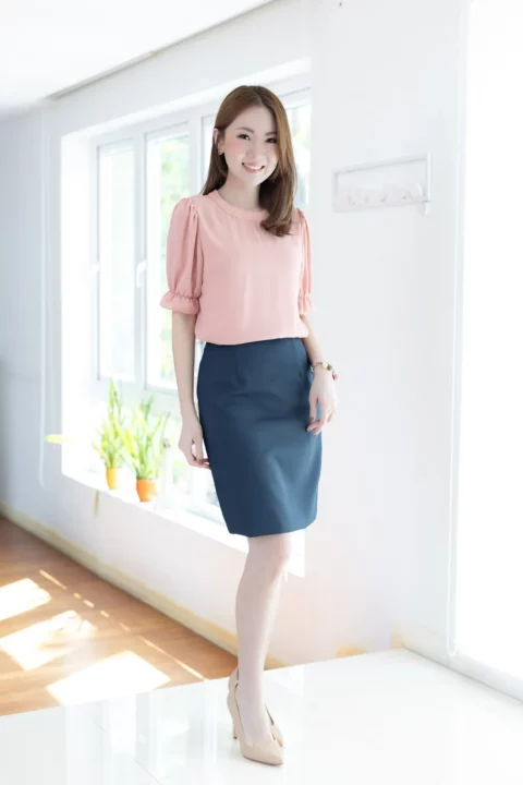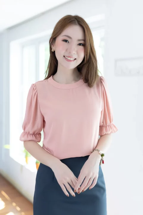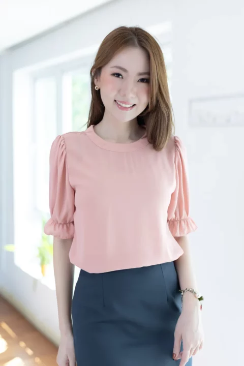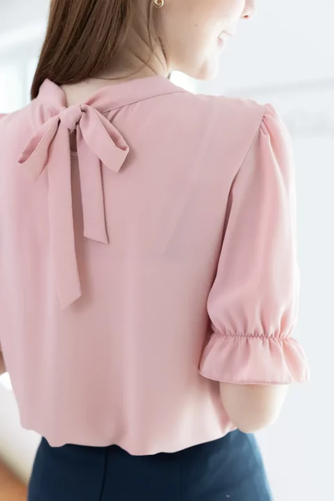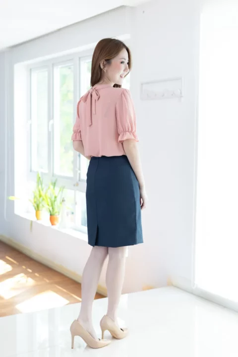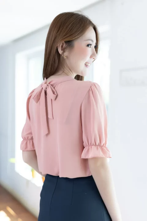 เสื้อน่ารักๆ คอกลม มีกิมมิคแต่งสายยาวด้านหลังไว้ผูกโบว์ แขนสั้นจั๊มยางยืด puff หน่อยๆ ทรงเสื้อคอดใต้อกเล็กน้อยใส่สวยไม่พอง ตัดเย็บด้วยผ้าชีฟองซูเปอร์