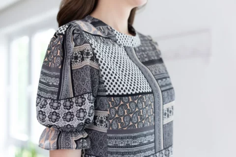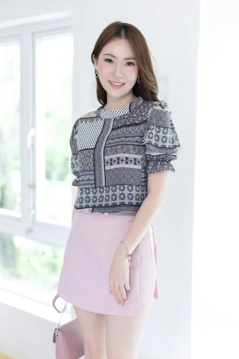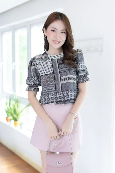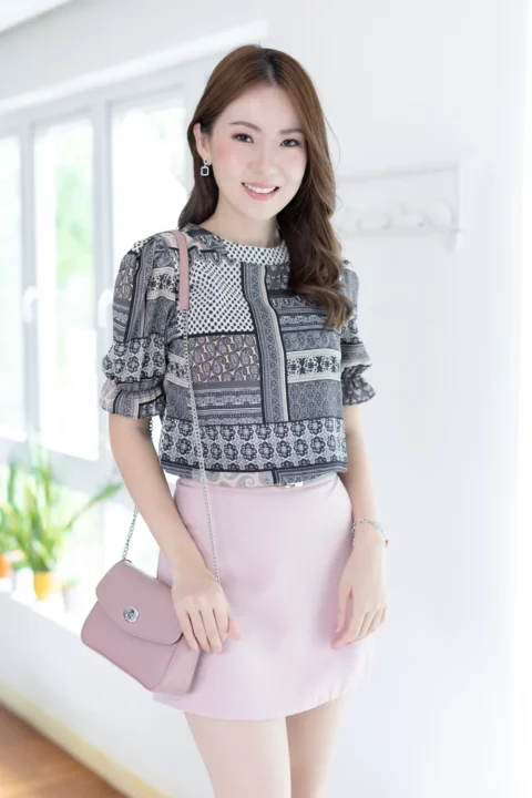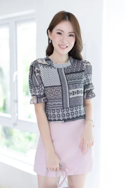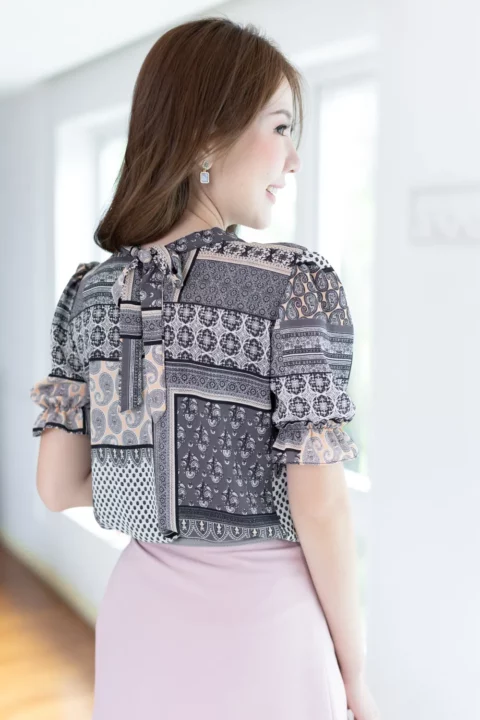 เสื้อน่ารักๆ คอกลม มีกิมมิคแต่งสายยาวด้านหลังไว้ผูกโบว์ แขนสั้นจั๊มยางยืด puff หน่อยๆ ทรงเสื้อคอดใต้อกเล็กน้อยใส่สวยไม่พอง ตัดเย็บด้วยผ้าชีฟองซูเปอร์พิมพ์ลายกราฟิกเก๋ๆสวยไม่ซ้ำใคร