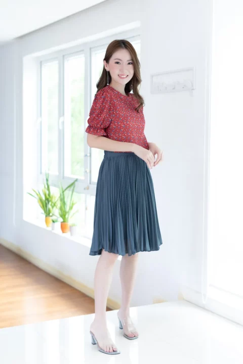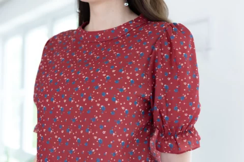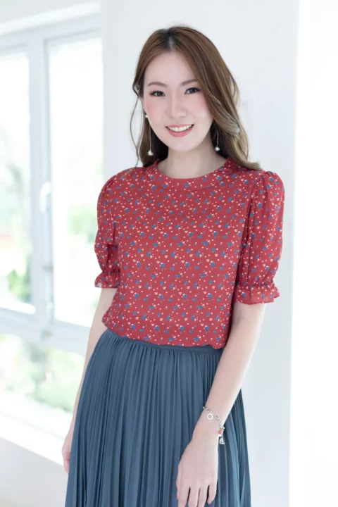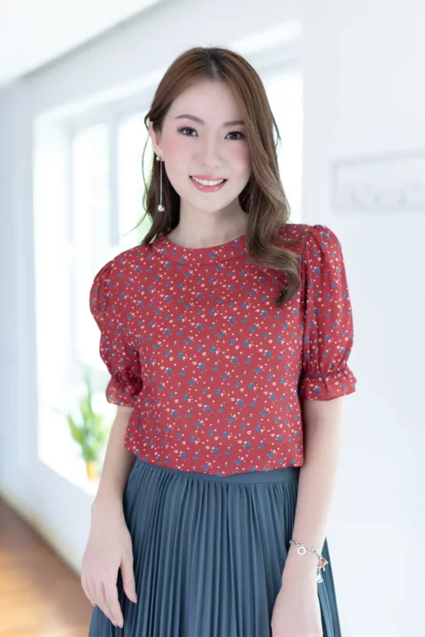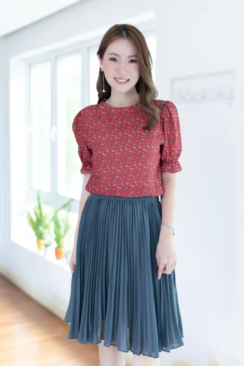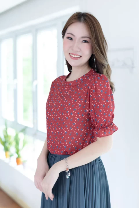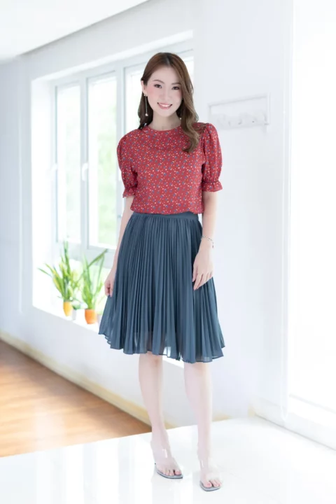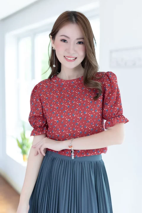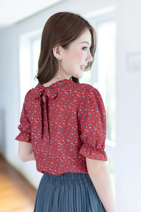 เสื้อน่ารักๆ คอกลม มีกิมมิคแต่งสายยาวด้านหลังไว้ผูกโบว์ แขนสั้นจั๊มยางยืด puff หน่อยๆ ทรงเสื้อคอดใต้อกเล็กน้อยใส่สวยไม่พอง ตัดเย็บด้วยผ้าชีฟองซูเปอร์พิมพ์ลายดอกไม้เล็กๆ