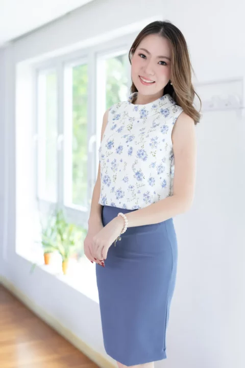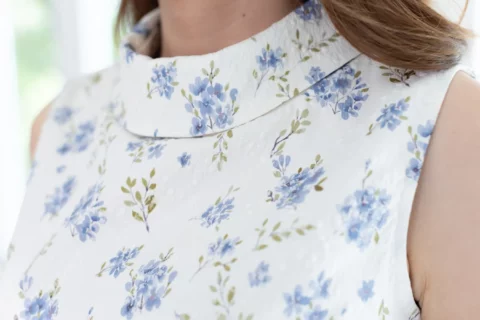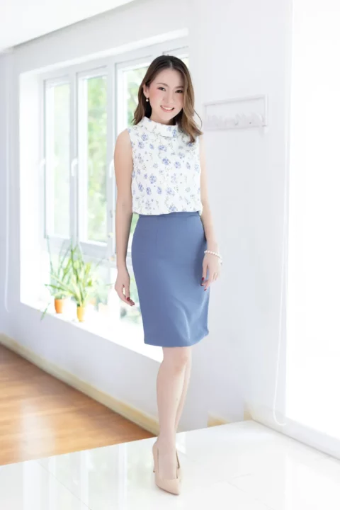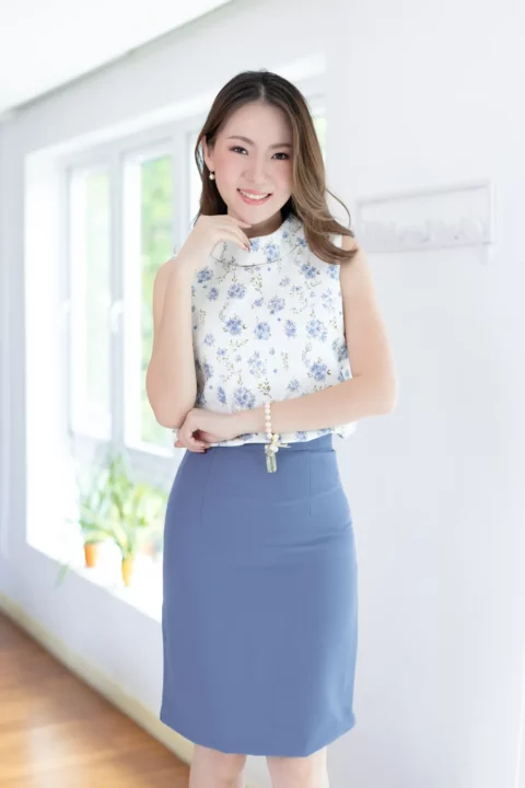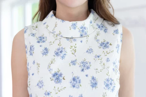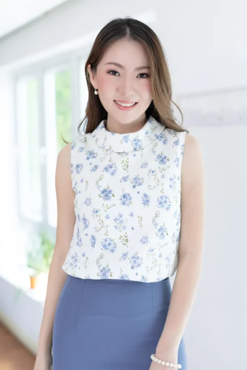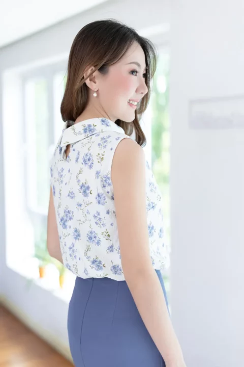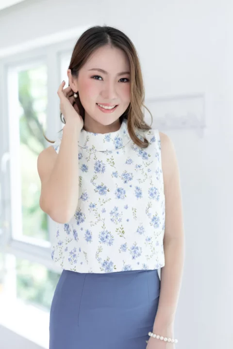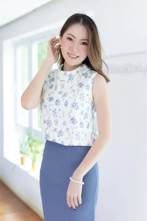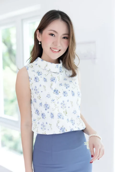 ปรับลุคให้สวยเด่นด้วยเสื้อแขนกุด ขอบคอสูงพับทบ ใช้ผ้าโพลีเอสเตอร์อัดย่น เนื้อยืดเล็กน้อย บนตัวผ้ามีดีเทลปั๊มลายเถาไม้นูนๆดูมีมิติ สวยงามเลอค่า Sweet & Elegant✨