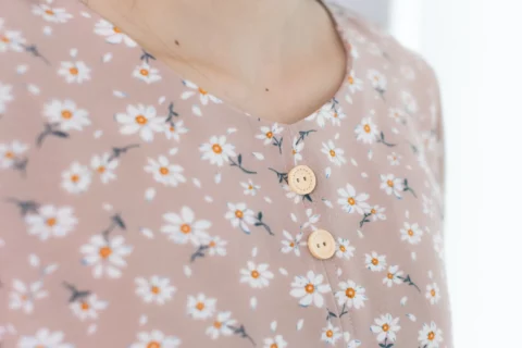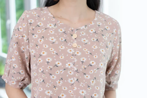 เสื้อคอกลม เติมกระดุมเรียงแถวด้านหน้าและคัตติ้งตะเข็บตรงกลาง ทรงแขนจับจีบความยาวปิดต้นแขนเกือบถึงช่วงศอก(ขึ้นอยู่กับสรีระ) ด้านหลังผ่าหยดน้ำติดกระดุมสวมใส่สะดวก เนื้อผ้าไหมอิตาลีเนียนๆ ลายดอกไม้ สวยเรียบง่าย เนื้อผ้ายืดหยุ่น