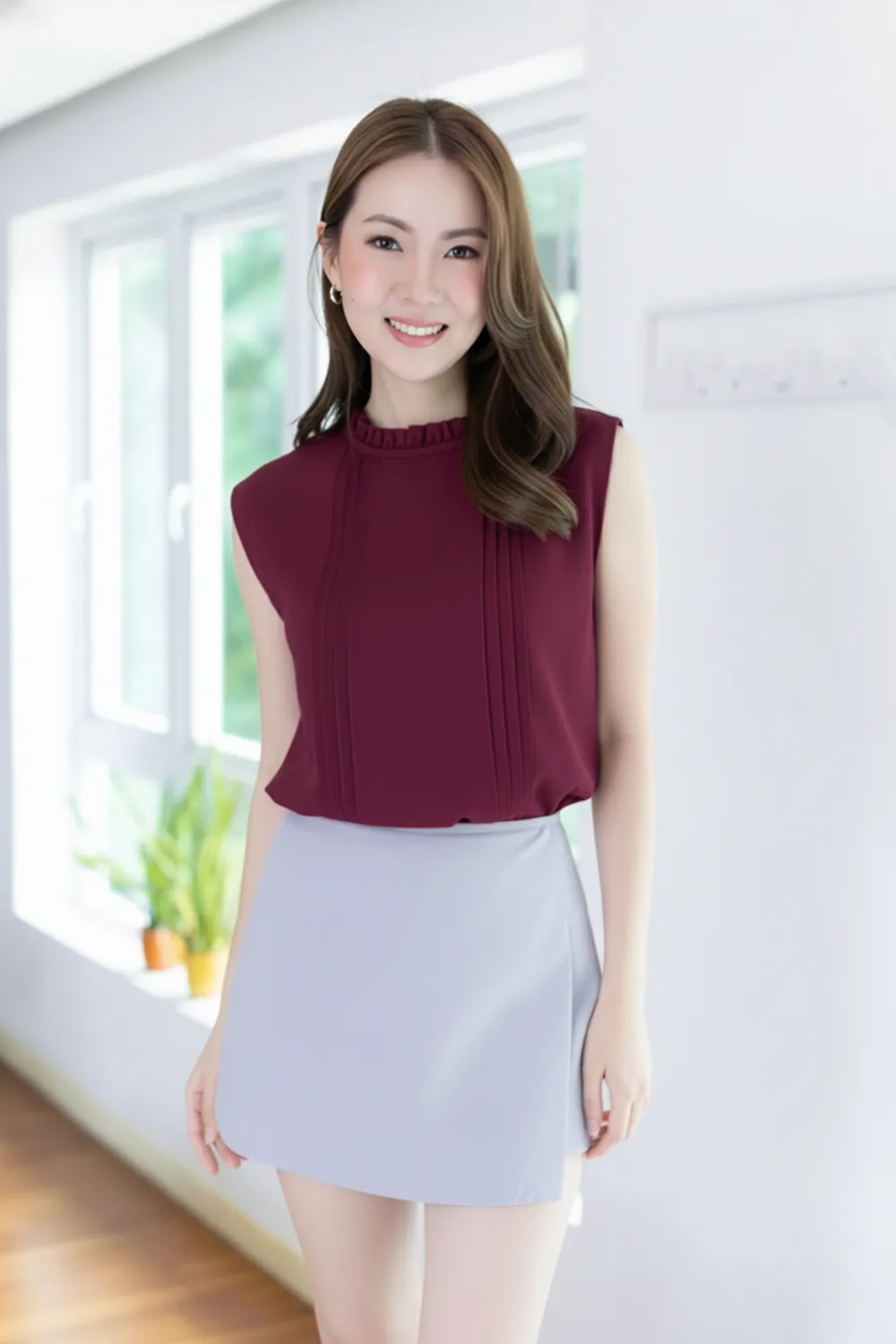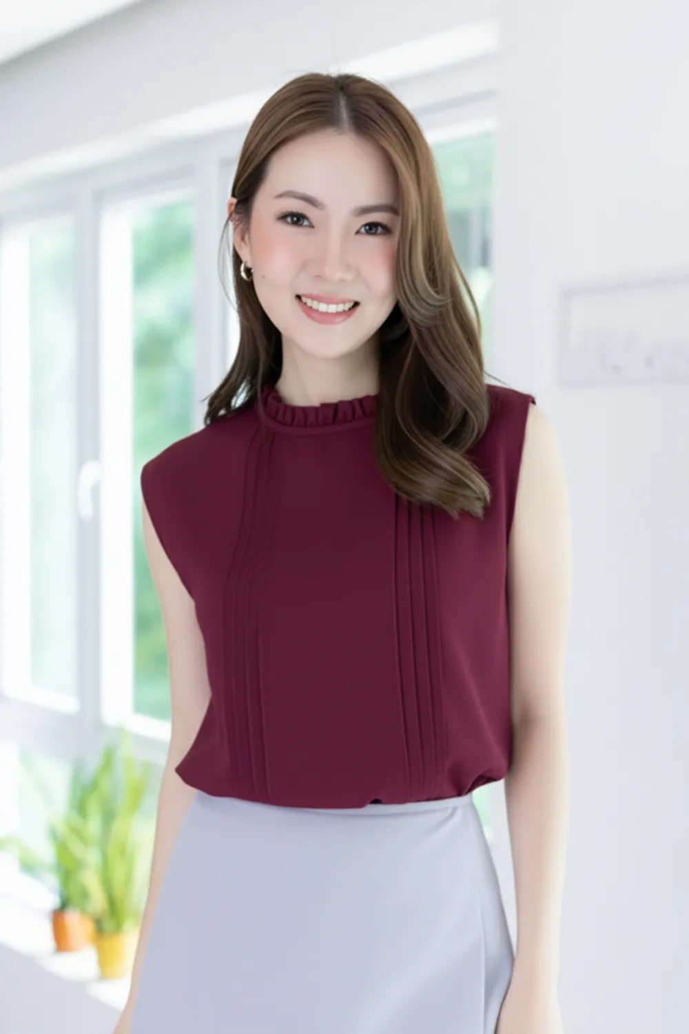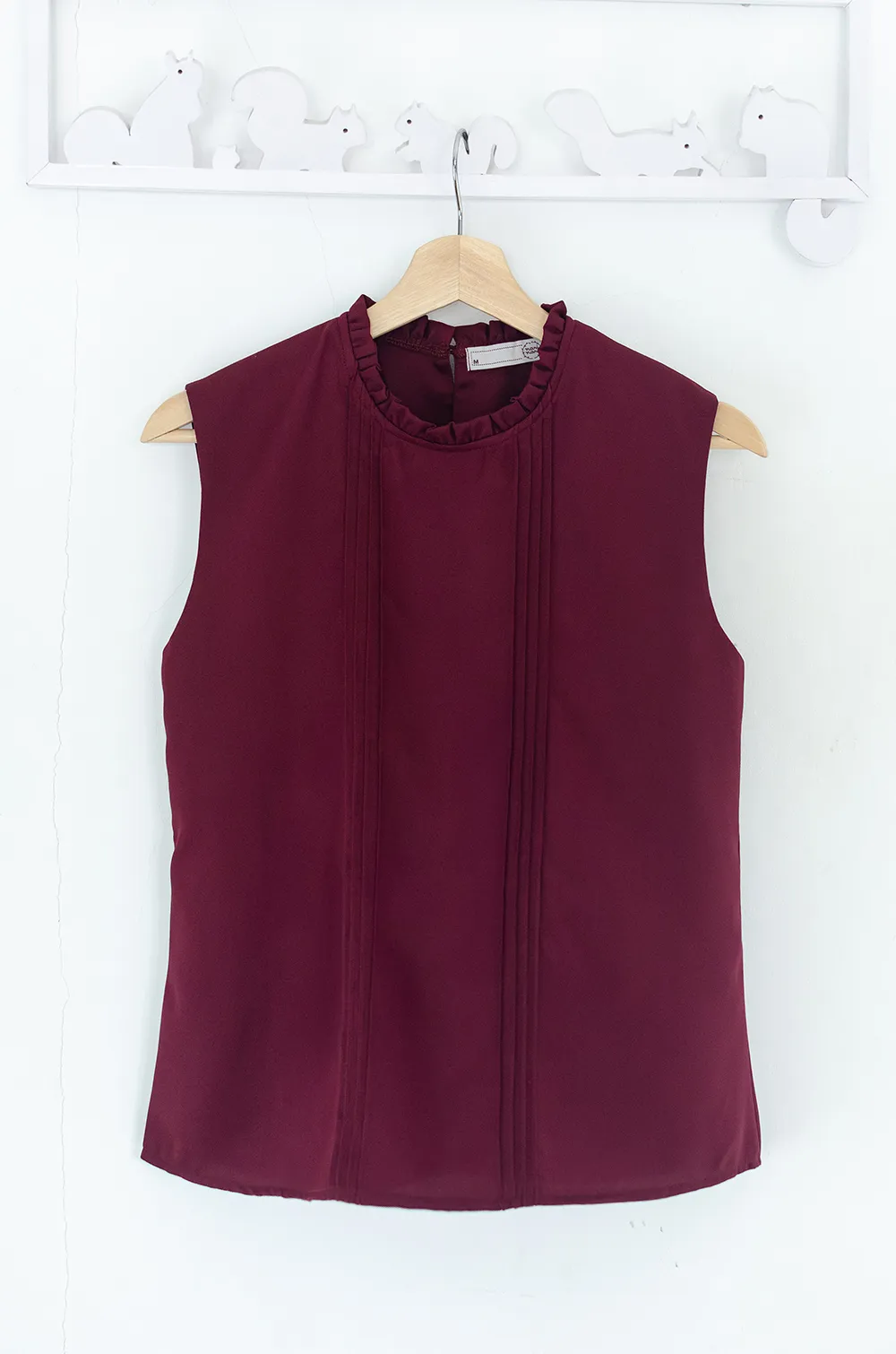 MT5700 Ruff Collar Pintuck Sleeveless Blouse – Red Wine