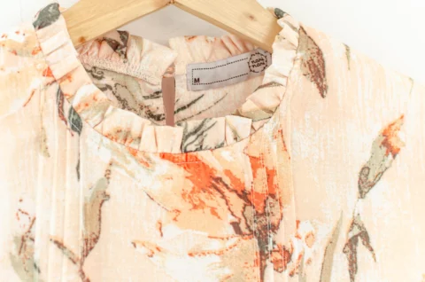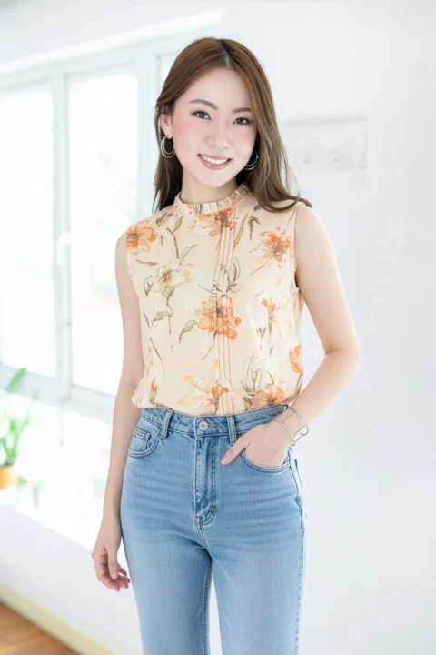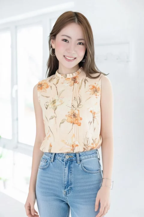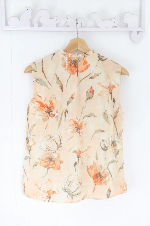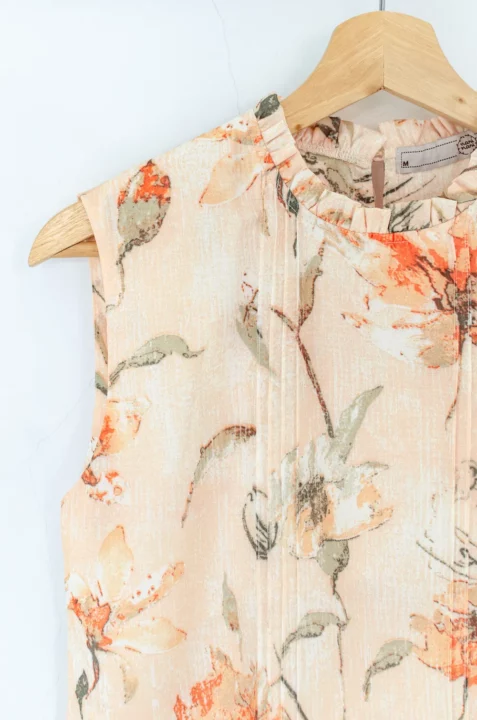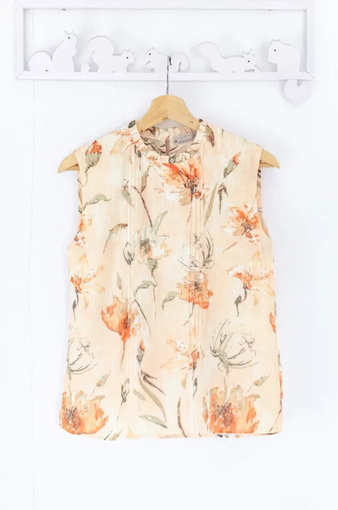 MT5700 Ruff Collar Pintuck Sleeveless Blouse – Floral Orange