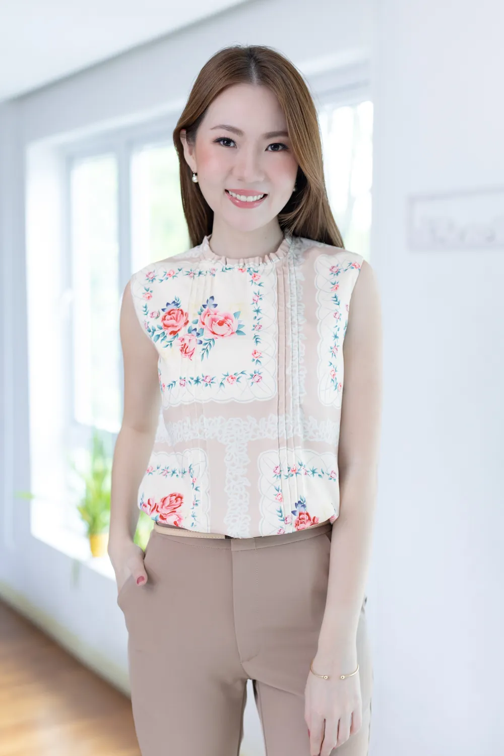 เสื้อแขนกุด คอกลมปิดแต่งจีบคอตั้งๆ ดีเทลเรียบเก๋ตีเกล็ดยาวด้านหน้า ผ่าหยดน้ำหลัง ตัดเย็บด้วยผ้าไหมอิตาลี เนื้อเนียน ไม่หนา พิมพ์ลายสวยหวานค่ะ