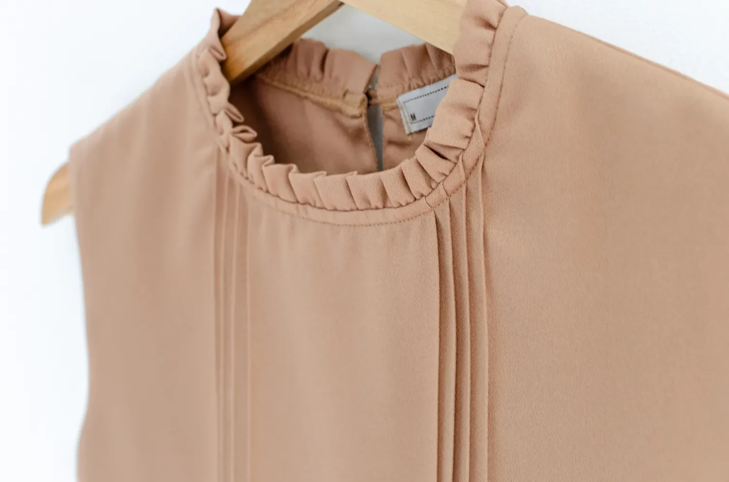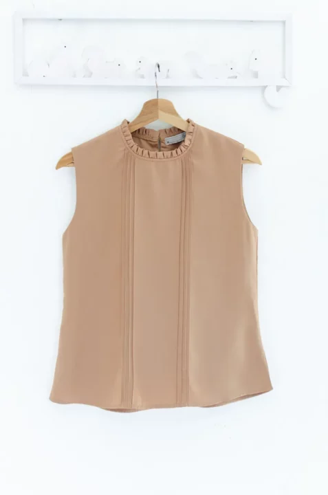 เสื้อแขนกุด คอกลมปิดแต่งจีบคอตั้งๆ ดีเทลเรียบเก๋ตีเกล็ดยาวด้านหน้า ผ่าหยดน้ำหลัง ตัดเย็บด้วยผ้าโฟร์เวย์ ไม่หนาไม่บางเกินไปทำให้แต่งตัวง่าย เนื้อผ้าโฟร์เวย์จะดูนุ่มๆ หนากว่าอิตาลีเล็กน้อย ผ้านิ่มๆค่ะ