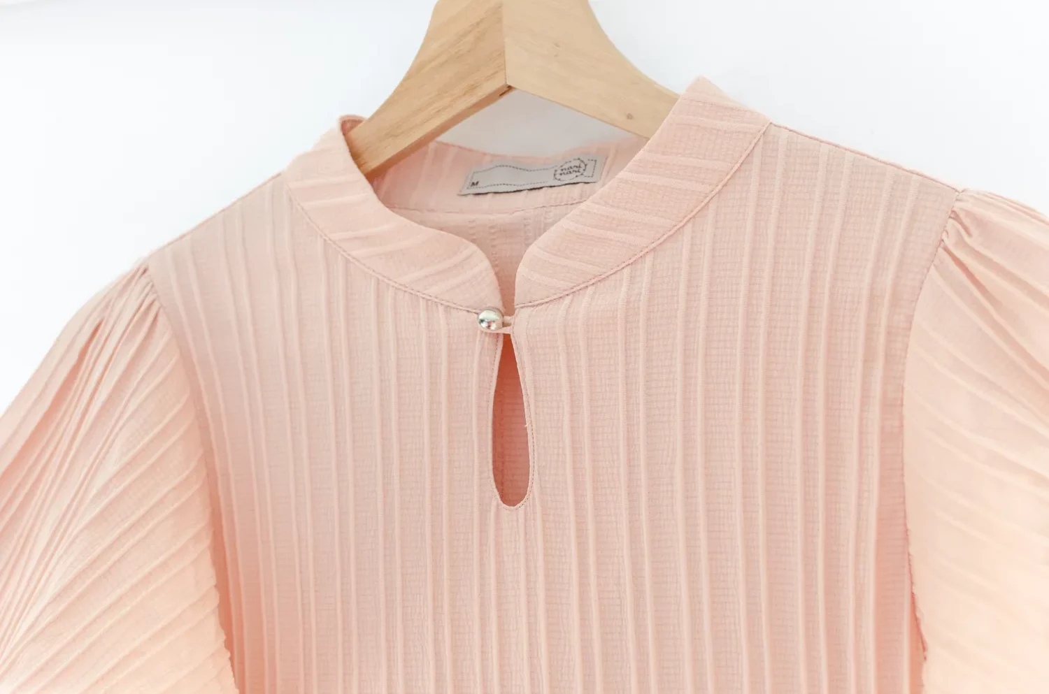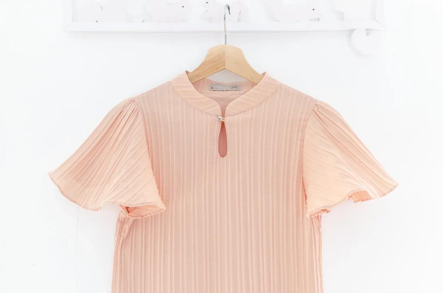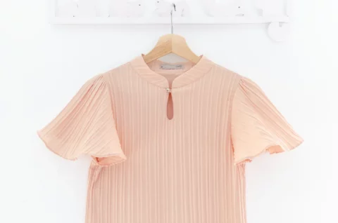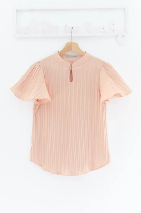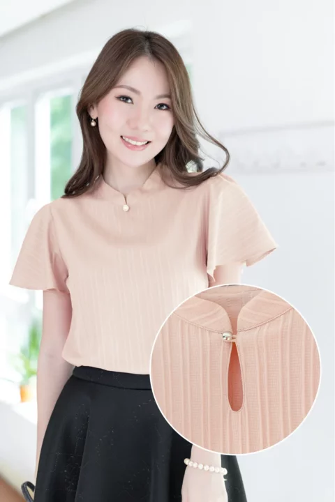 เสื้อแขนผีเสื้อพลิ้วๆใส่แล้วรู้สึกสวยละมุน ด้านหน้าผ่าหยดน้ำติดกระดุม ใช้ผ้าอัดลายเป็น Texture ลายริ้วยาวลงมา เนื้อไม่หนาแต่ไม่บางโปร่งโป๊ น่ารัก สดใสมากค่ะ