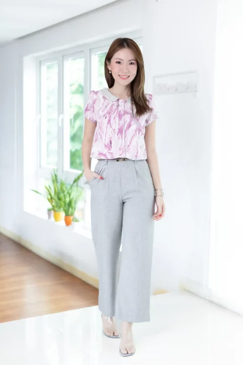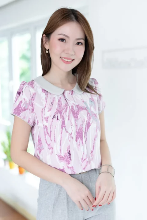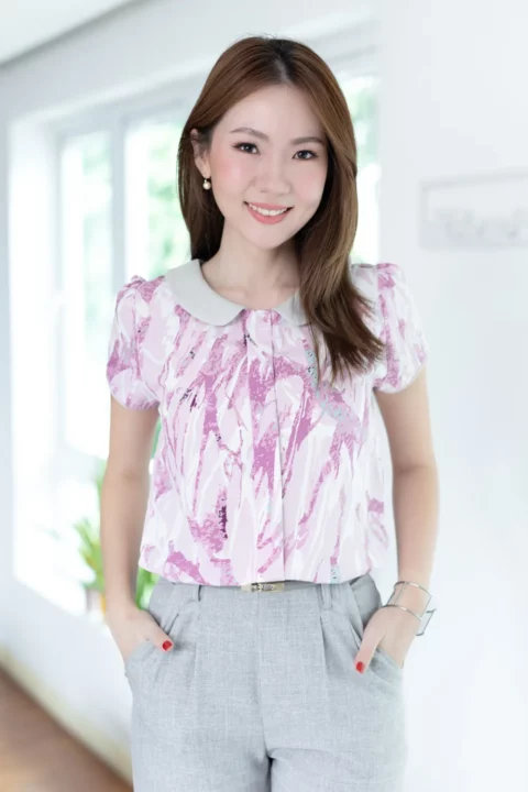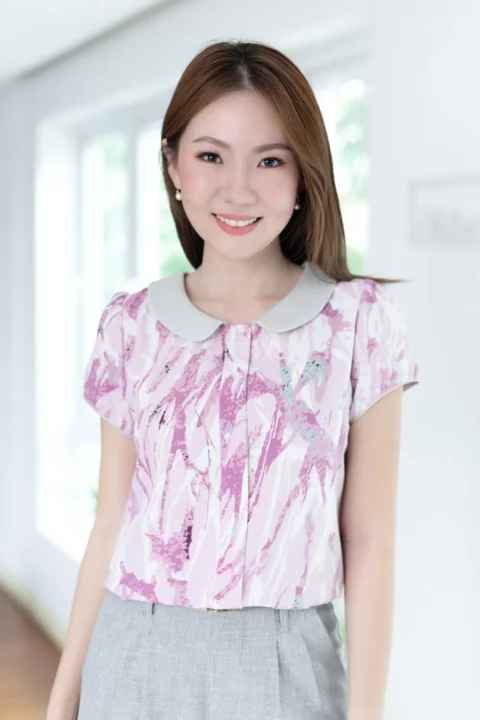 เสื้อน่ารัก ทรงพอดีตัว แต่งปกบัวมาแบบขนาดเล็ก แขนตุ๊กตาสั้นๆแต่งกุ๊นปลายแขนเข้ากันกับสีปก ด้านหน้าแต่งสาบหลอก ผ่าหยดน้ำหลังช่วยให้สวมใส่สะดวก