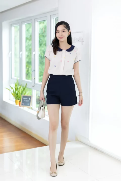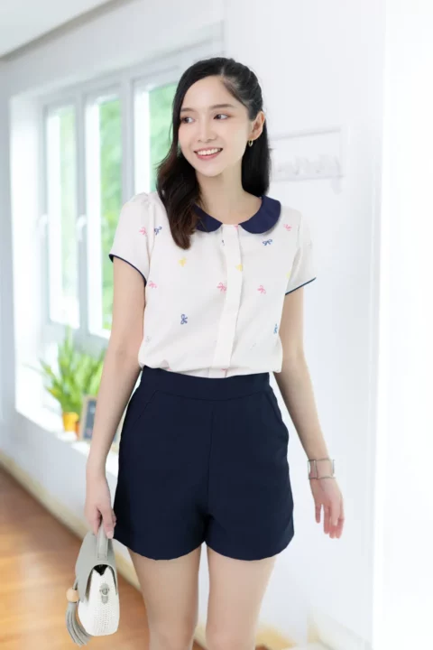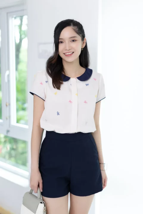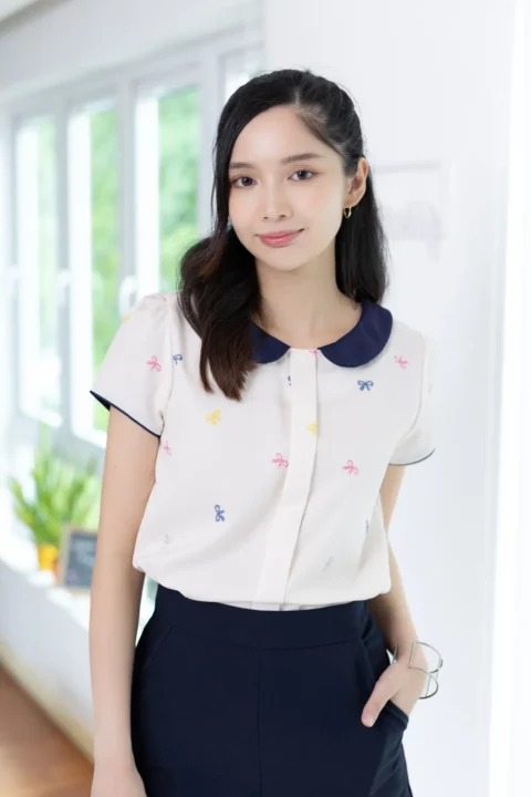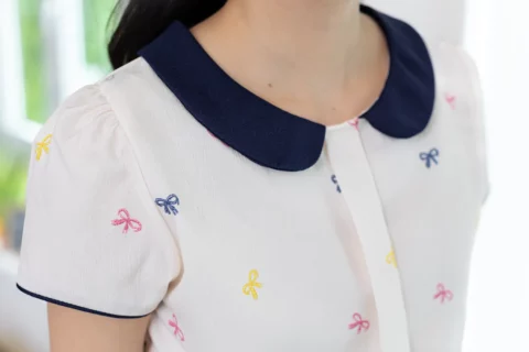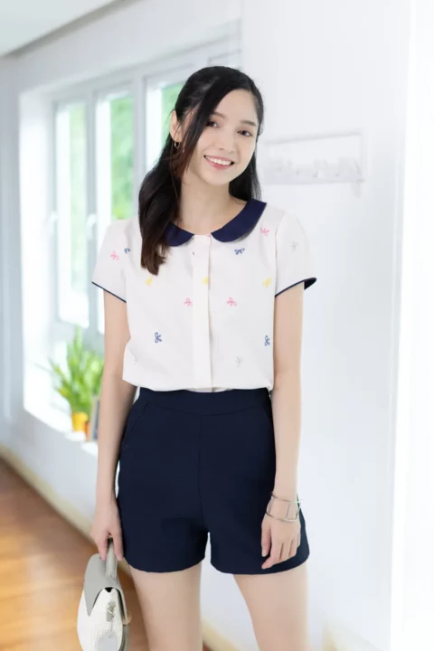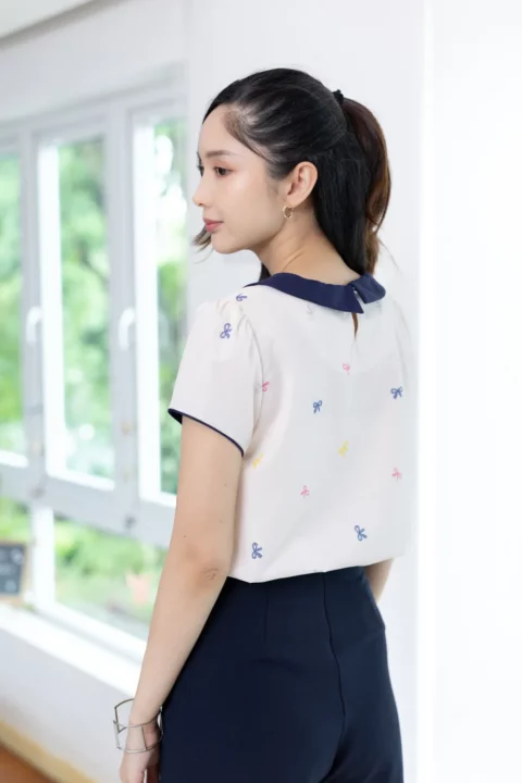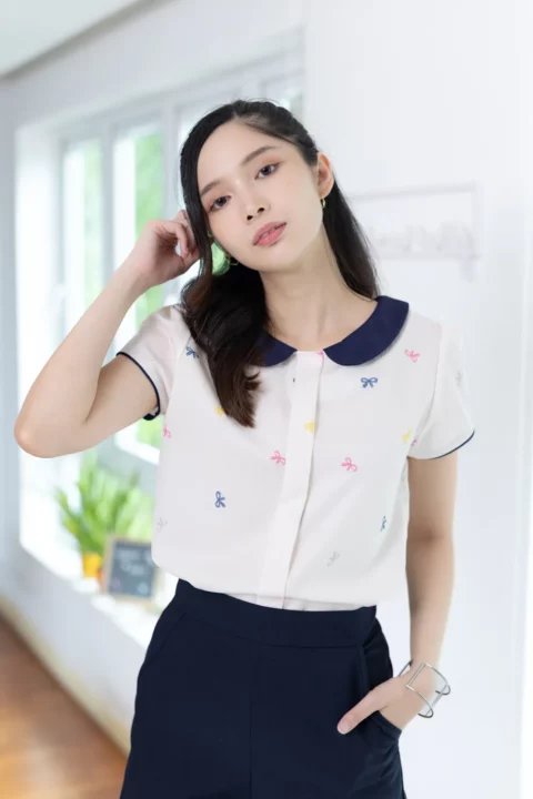 เสื้อน่ารัก ทรงพอดีตัว แต่งปกบัวมาแบบขนาดเล็ก แขนตุ๊กตาสั้นๆแต่งกุ๊นปลายแขนเข้ากันกับสีปก ด้านหน้าแต่งสาบหลอก ผ่าหยดน้ำหลังช่วยให้สวมใส่สะดวก