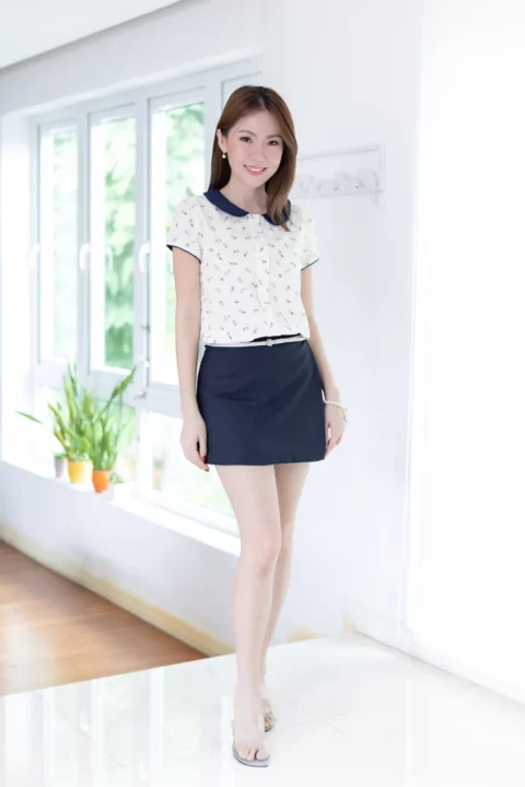 เสื้อน่ารัก ทรงพอดีตัว แต่งปกบัวมาแบบขนาดเล็ก แขนตุ๊กตาสั้นๆแต่งกุ๊นปลายแขนเข้ากันกับสีปก ด้านหน้าแต่งสาบหลอก ผ่าหยดน้ำหลังช่วยให้สวมใส่สะดวก