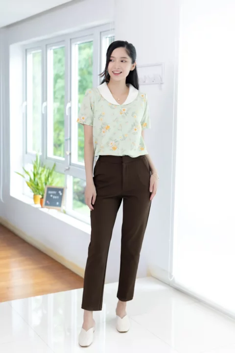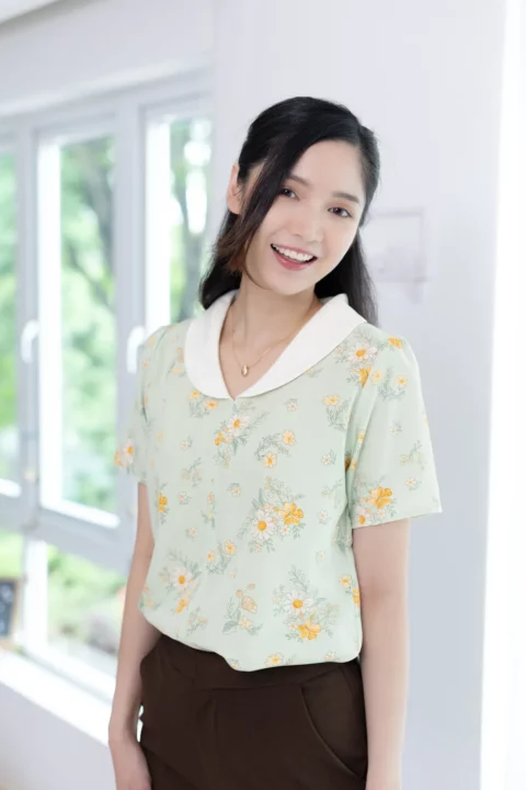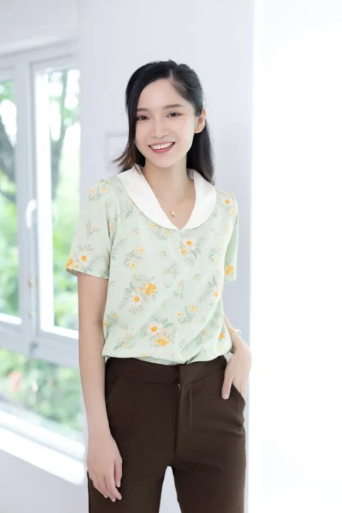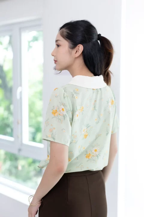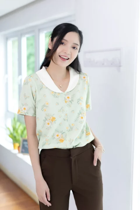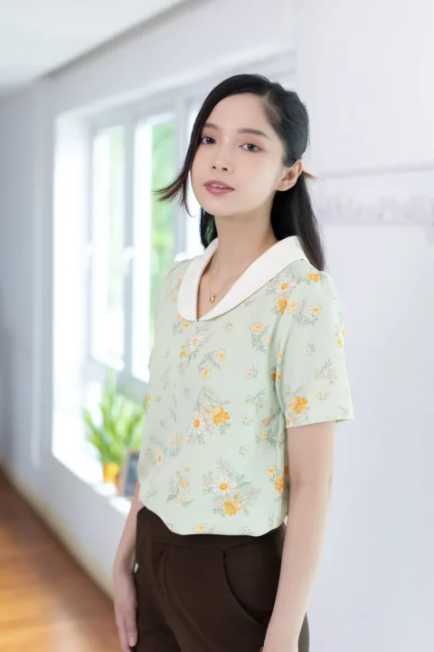 เสื้อปกบัวโค้งน่ารัก ตัดต่อคัตติ้งกลางลำตัว แขนสั้นแบบไม่สั้นมาก ผ้าไหมอิตาลีเนื้อดี เนียนสบายผิว ทรงเสื้อเป็นแบบสวมไม่มีกระดุมหลังคอ สวยเรียบง่าย