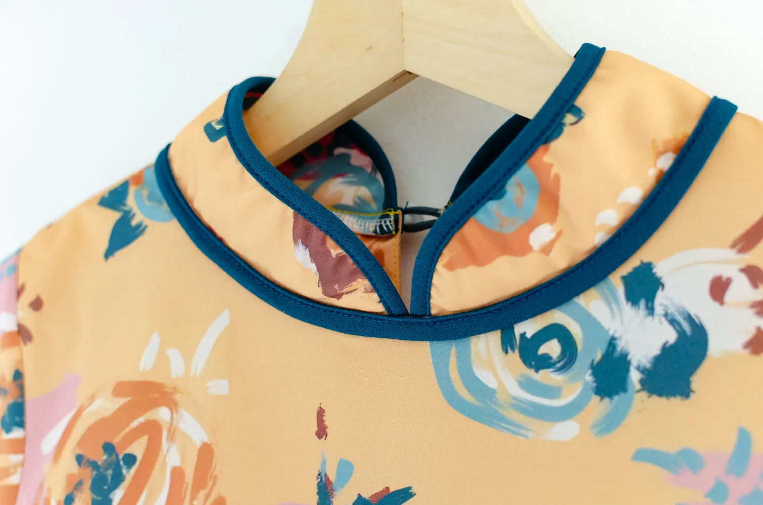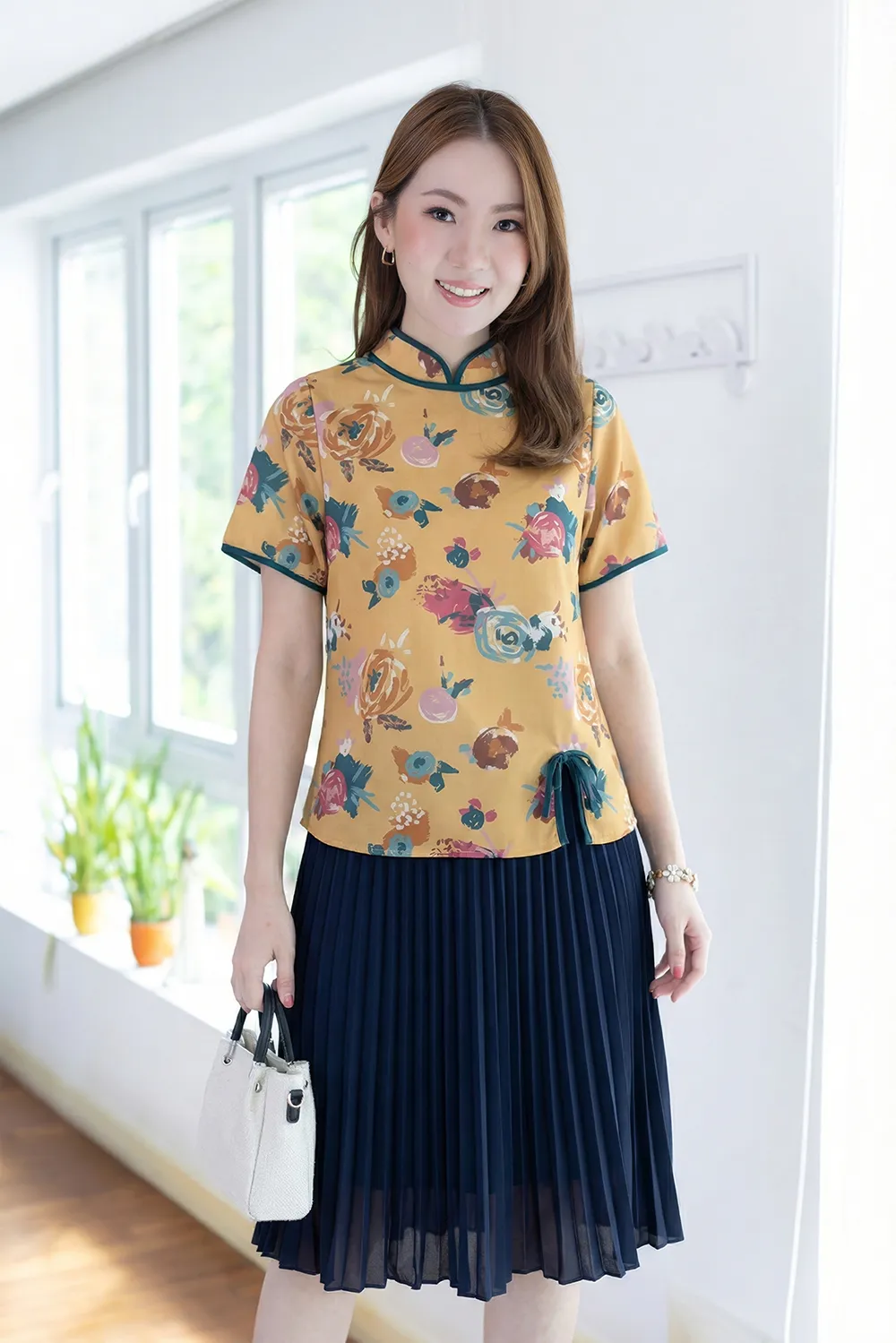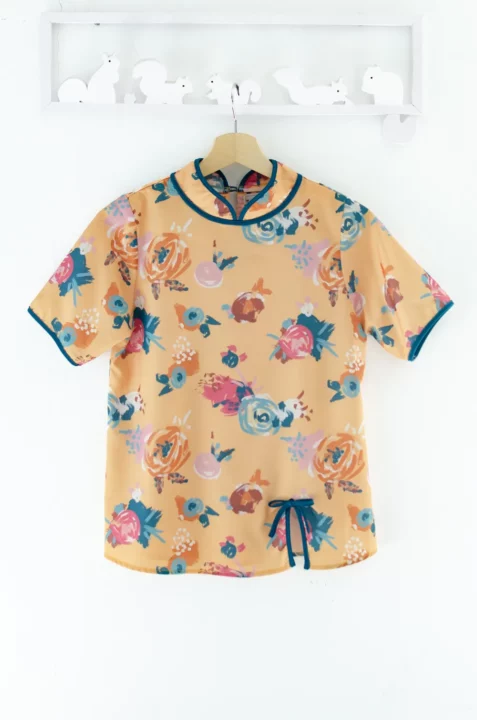เสื้อคอจีนทรงคอปิดสูง กุ๊นงามๆด้วยสีตัดกัน ใส่แบบปล่อยโชว์ชายเสื้อ ผ่าข้างตกแต่งกุ๊นและกระดุมสไตล์จีน ใช้ผ้าพิมพ์ลายดอกไม้ เนื้อเนียนสบายผิว สวยสดใสรับปีใหม่ 🪭🐦🔥