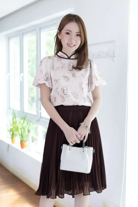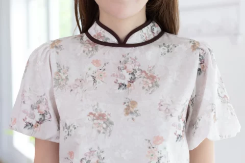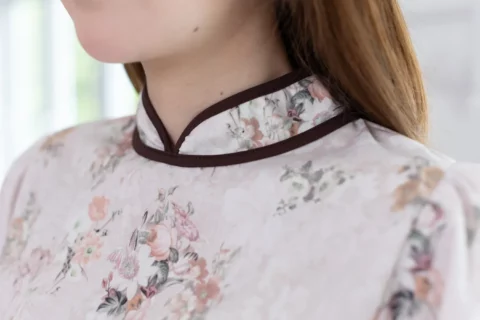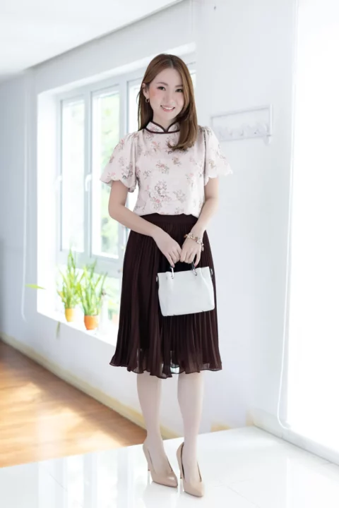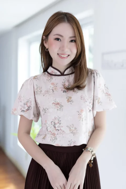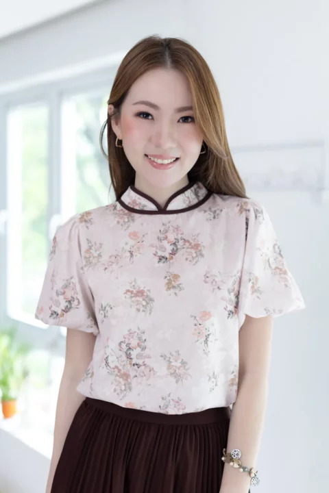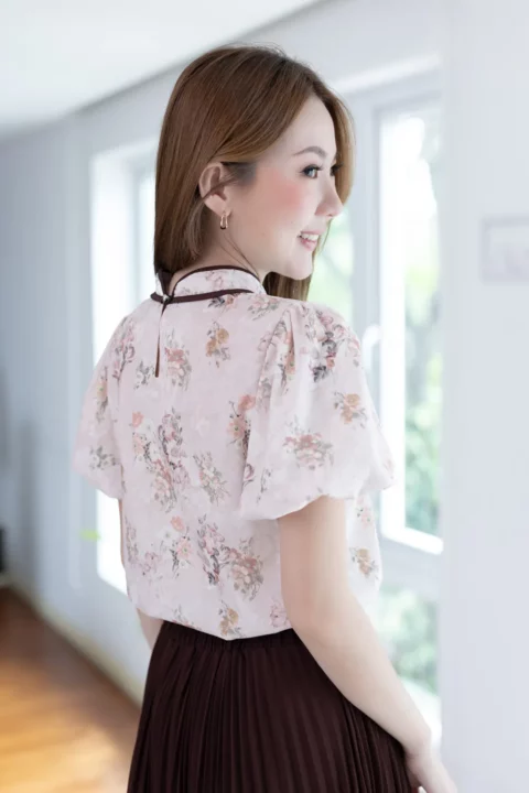 เสื้อคอจีนสูง ใช้ผ้าพิมพ์ลายดอกไม้ คอปิด กุ๊นงามๆด้วยสีตัดกัน ทรงแขนบอลลูน ปลายจั๊มยางยืดแบบซ่อน ทรงชายเสื้อโค้งนิดๆ เป็นชิ้นที่สวมใส่แล้วสวยโดดเด่นแน่นอนนน