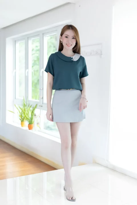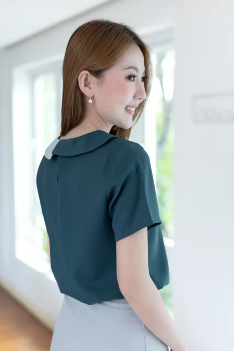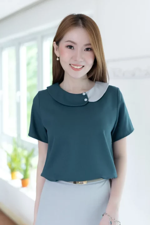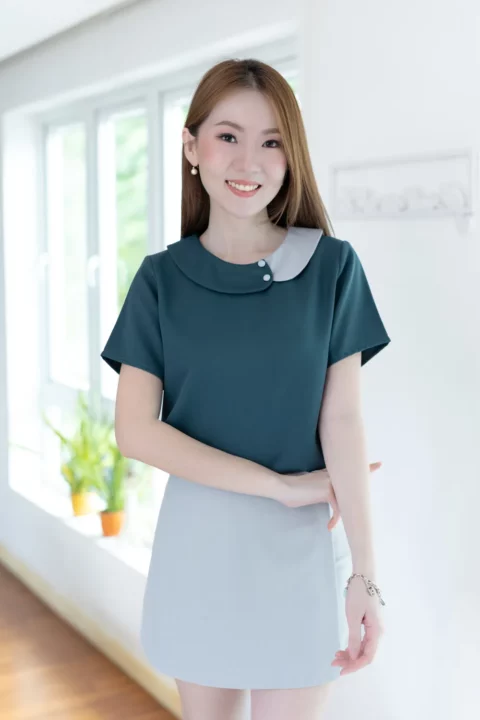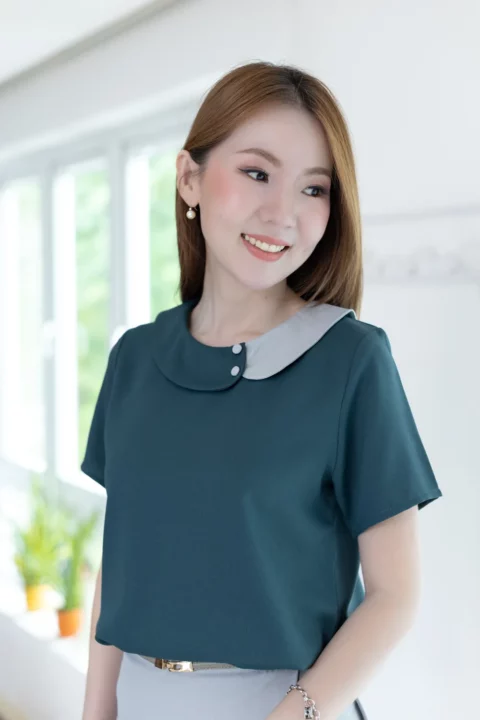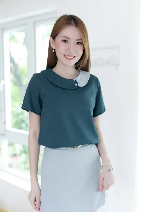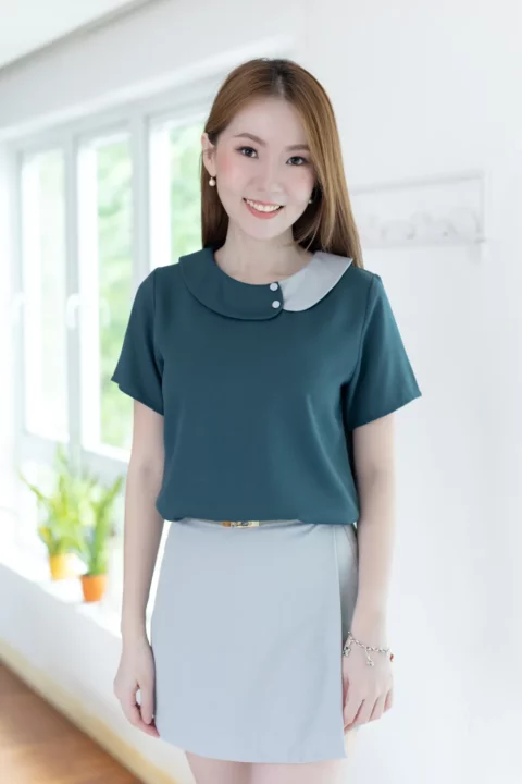 เสื้อทรงสวย แต่งคอปกบัวซ้อนใช้สีผ้าคอนทราสต์กัน เพิ่มกระดุมหลอกคู่หน้าให้ดูมีลูกเล่น เสื้อเป็นแบบสวม แขนสั้น ใส่ง่ายลุคเรียบร้อยแต่ดูสดใส เหมาะทั้งใส่ทำงานและวันสบาย ๆ แมตช์ง่ายได้หลายโทน มีให้เลือกทั้งสีพื้นและผ้าพิมพ์ลาย