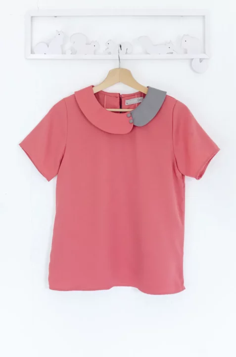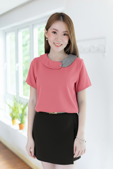เสื้อทรงสวย แต่งคอปกบัวซ้อนใช้สีผ้าคอนทราสต์กัน เพิ่มกระดุมหลอกคู่หน้าให้ดูมีลูกเล่น เสื้อเป็นแบบสวม แขนสั้น ใส่ง่ายลุคเรียบร้อยแต่ดูสดใส เหมาะทั้งใส่ทำงานและวันสบาย ๆ แมตช์ง่ายได้หลายโทน มีให้เลือกทั้งสีพื้นและผ้าพิมพ์ลาย
