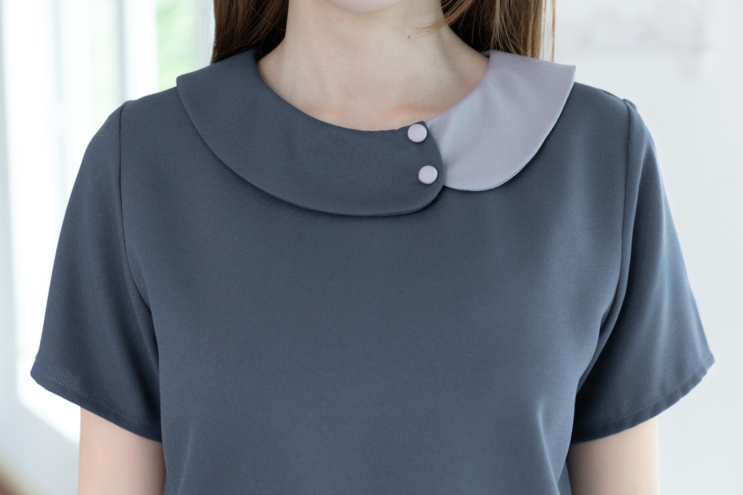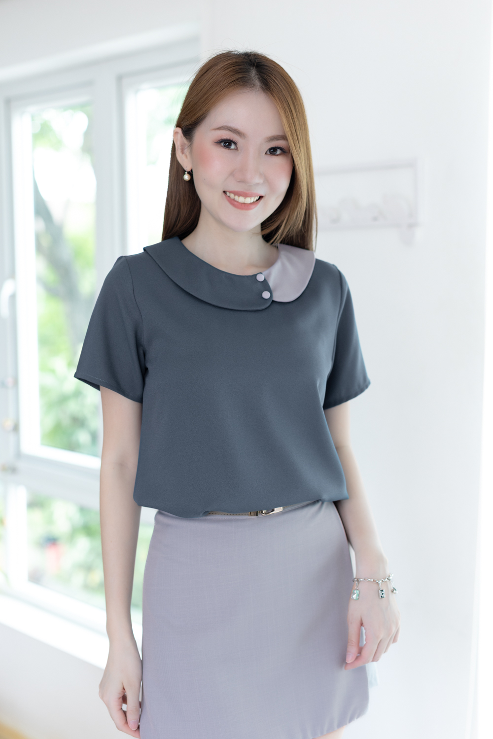 เสื้อทรงสวย แต่งคอปกบัวซ้อนใช้สีผ้าคอนทราสต์กัน เพิ่มกระดุมหลอกคู่หน้าให้ดูมีลูกเล่น เสื้อเป็นแบบสวม แขนสั้น ใส่ง่ายลุคเรียบร้อยแต่ดูสดใส เหมาะทั้งใส่ทำงานและวันสบาย ๆ แมตช์ง่ายได้หลายโทน มีให้เลือกทั้งสีพื้นและผ้าพิมพ์ลาย