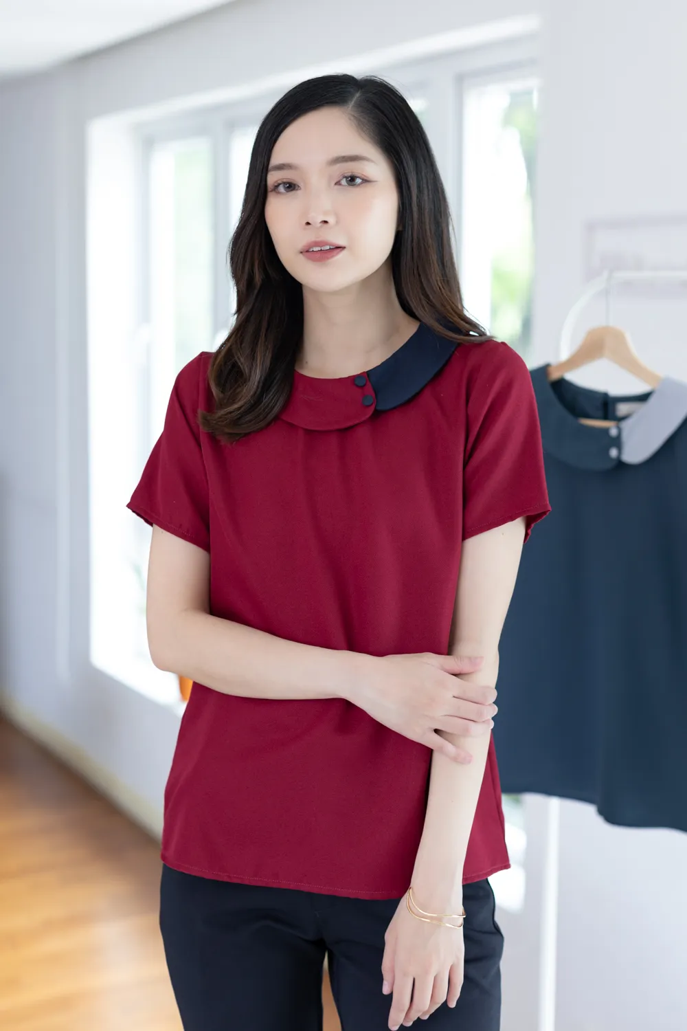 เสื้อทรงสวย แต่งคอปกบัวซ้อนใช้สีผ้าคอนทราสต์กัน เพิ่มกระดุมหลอกคู่หน้าให้ดูมีลูกเล่น เสื้อเป็นแบบสวม แขนสั้น ใส่ง่ายลุคเรียบร้อยแต่ดูสดใส เหมาะทั้งใส่ทำงานและวันสบาย ๆ แมตช์ง่ายได้หลายโทน มีให้เลือกทั้งสีพื้นและผ้าพิมพ์ลาย