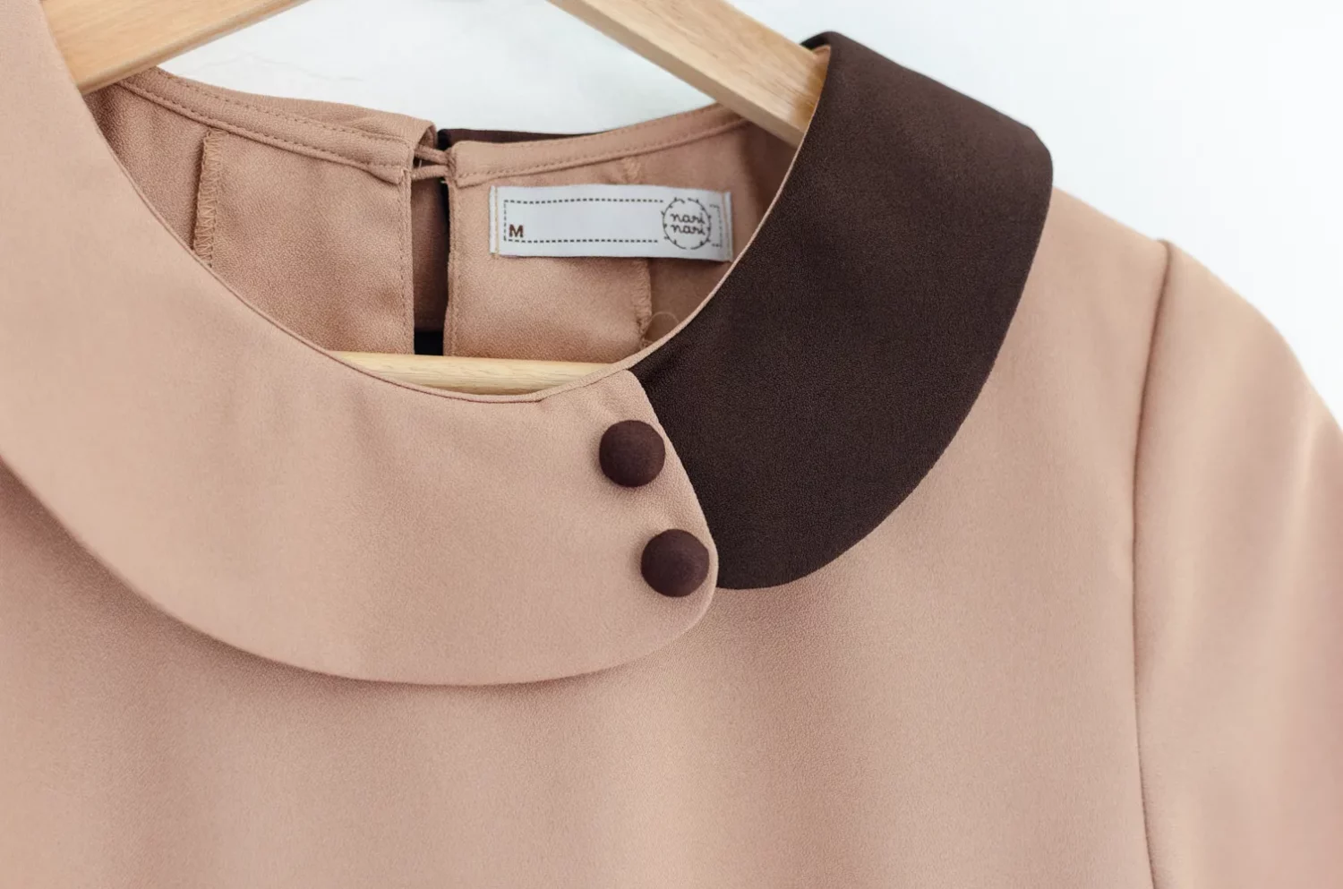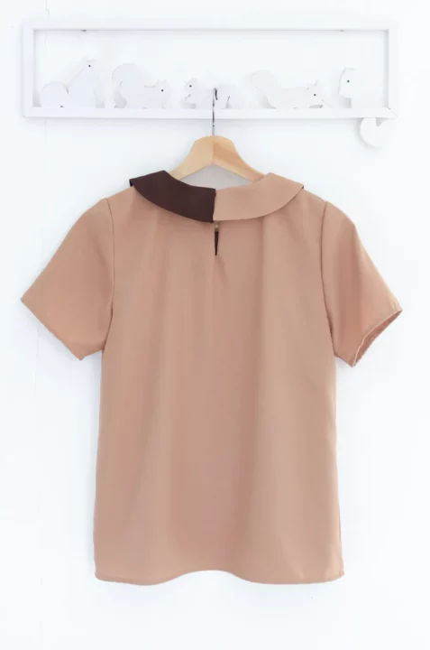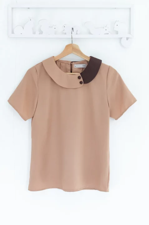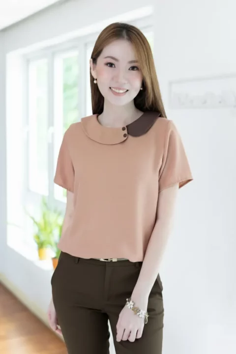 เสื้อทรงสวย แต่งคอปกบัวซ้อนใช้สีผ้าคอนทราสต์กัน เพิ่มกระดุมหลอกคู่หน้าให้ดูมีลูกเล่น เสื้อเป็นแบบสวม แขนสั้น ใส่ง่ายลุคเรียบร้อยแต่ดูสดใส เหมาะทั้งใส่ทำงานและวันสบาย ๆ แมตช์ง่ายได้หลายโทน มีให้เลือกทั้งสีพื้นและผ้าพิมพ์ลาย