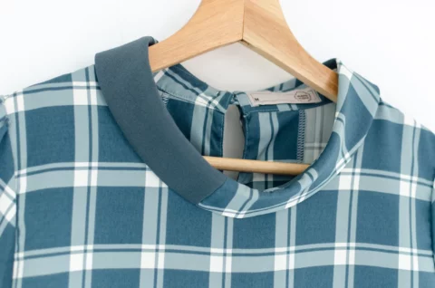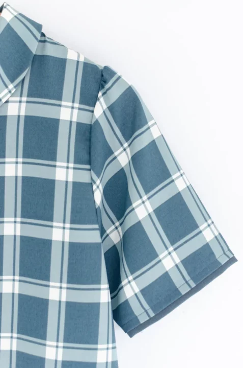เสื้อดีไซน์คอพับสูง แขนสั้น จีบรูดหัวไหล่เล็กน้อยให้ไม่ดูแข็ง แต่งผ้าสีตัดเพิ่มดีเทลเก๋โดดเด่นตรงคอและปลายแขน เสื้อผ่ากระดุมด้านหลังคอเพื่อความสะดวกในการสวมใส่ เนื้อผ้ารีดง่ายและดูแลง่าย