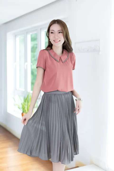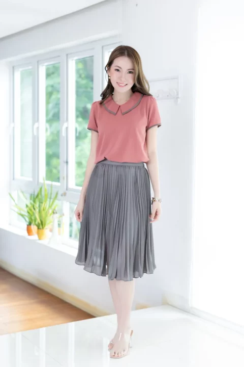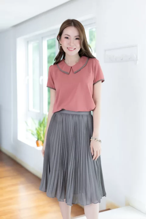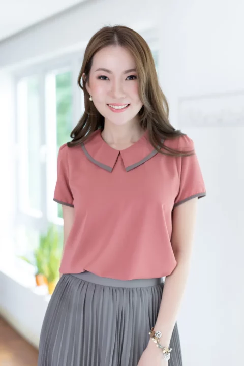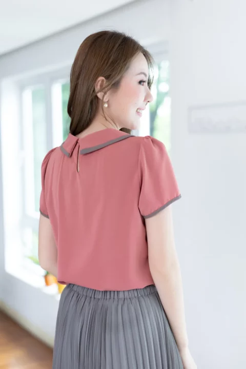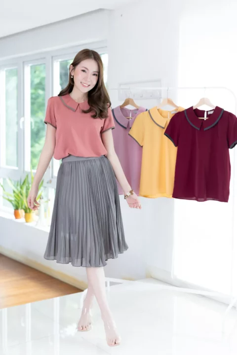 เสื้อทำงานทรงปกบัวตัดปลายแหลม แขนสั้น แต่งขอบสีตัดกัน คลาสสิคใส่ได้เรื่อยๆเลย เนื้อผ้านิ่มเนียนและทิ้งตัว สัมผัสดีสบายผิว ผ้าไม่โปร่งแสงมาก ไม่หนาเกินไปค่ะ