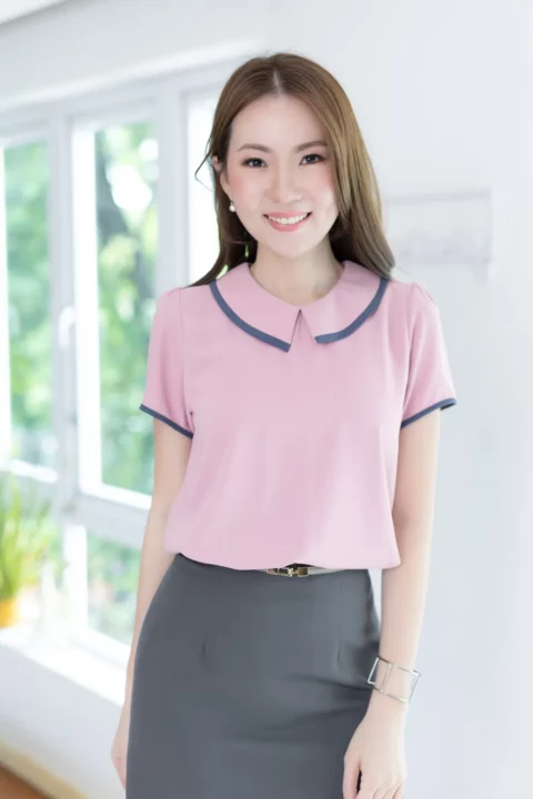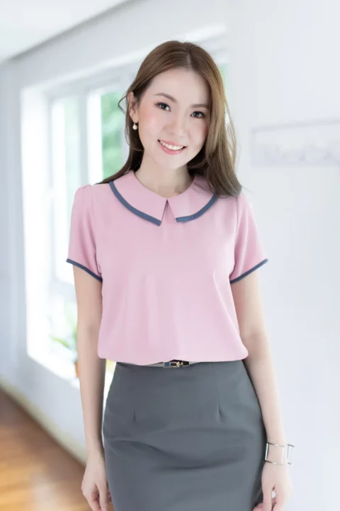 เสื้อทำงานทรงปกบัวตัดปลายแหลม แขนสั้น แต่งขอบสีตัดกัน คลาสสิคใส่ได้เรื่อยๆเลย เนื้อผ้านิ่มเนียนและทิ้งตัว สัมผัสดีสบายผิว ผ้าไม่โปร่งแสงมาก ไม่หนาเกินไปค่ะ