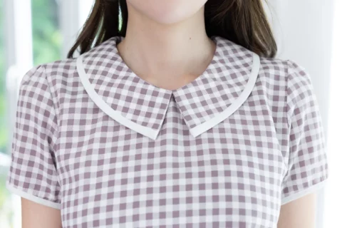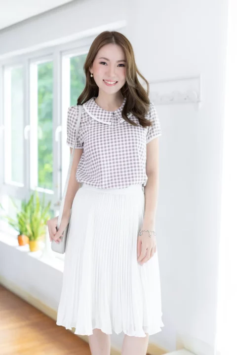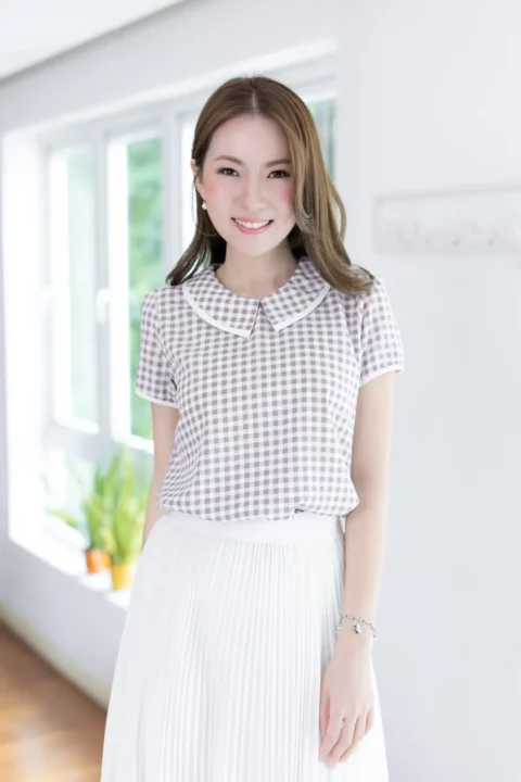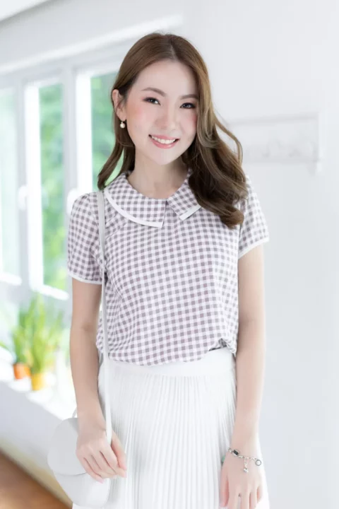 เสื้อทำงานทรงปกบัวตัดปลายแหลม แขนสั้น แต่งขอบสีตัดกัน คลาสสิคใส่ได้เรื่อยๆเลย เนื้อผ้านิ่มเนียน พิมพ์ลายตาราง