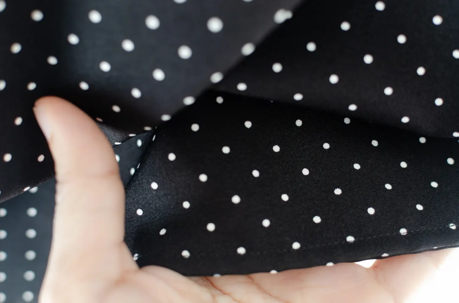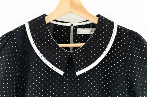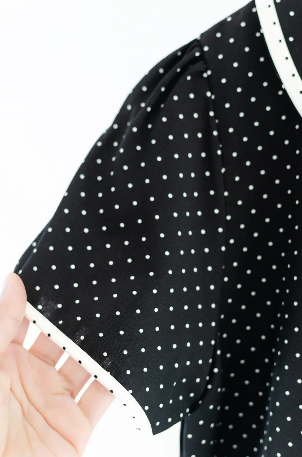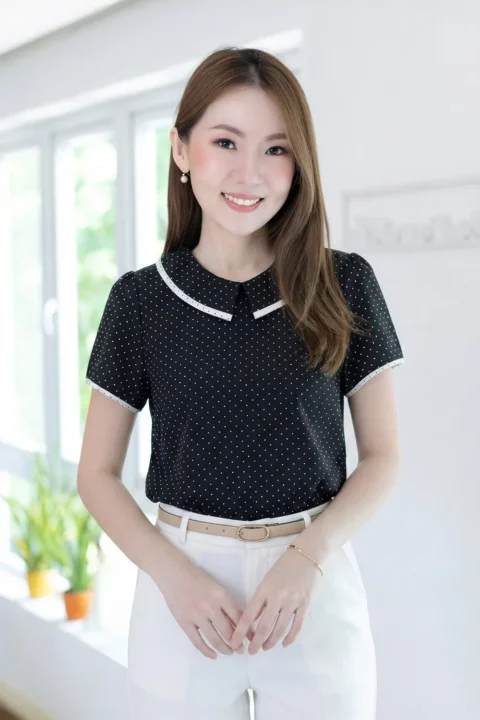 เสื้อทำงานทรงปกบัวตัดปลายแหลม แขนสั้น แต่งขอบสีตัดกัน คลาสสิคใส่ได้เรื่อยๆเลย เนื้อผ้านิ่มเนียน พิมพ์ลายจุด