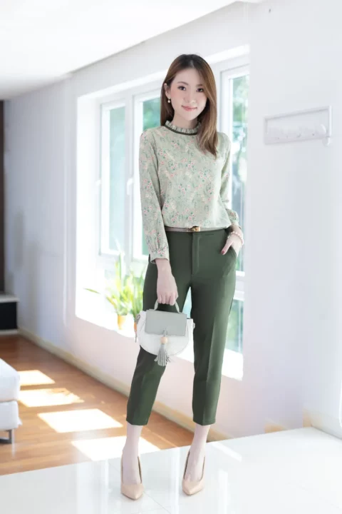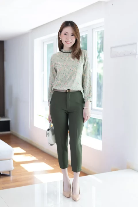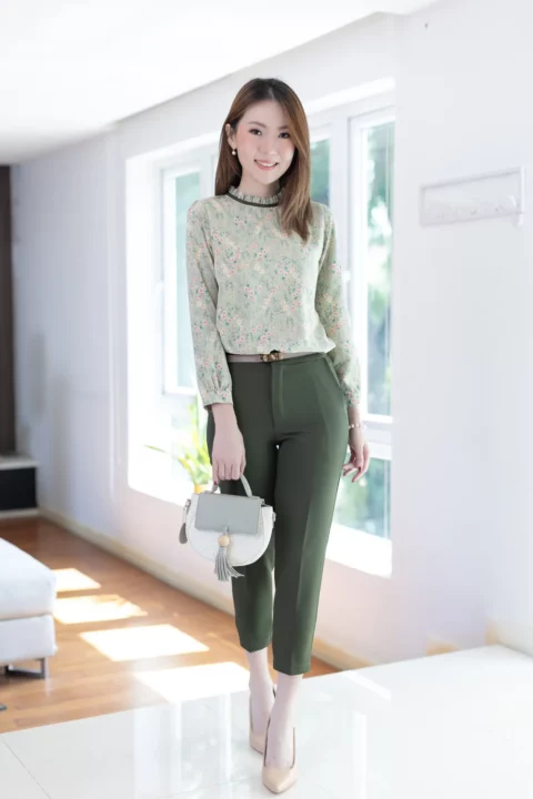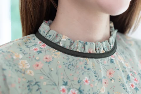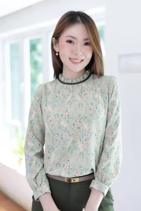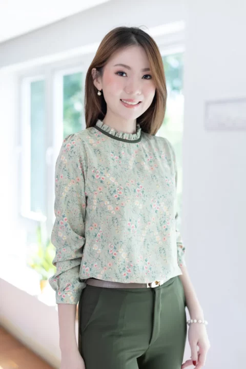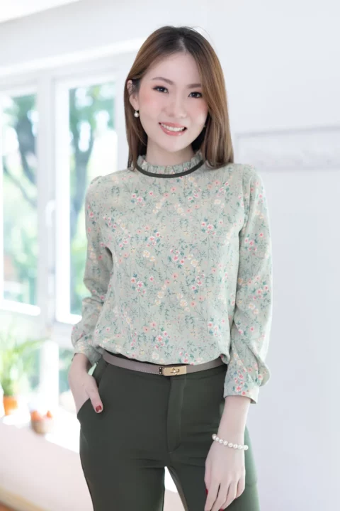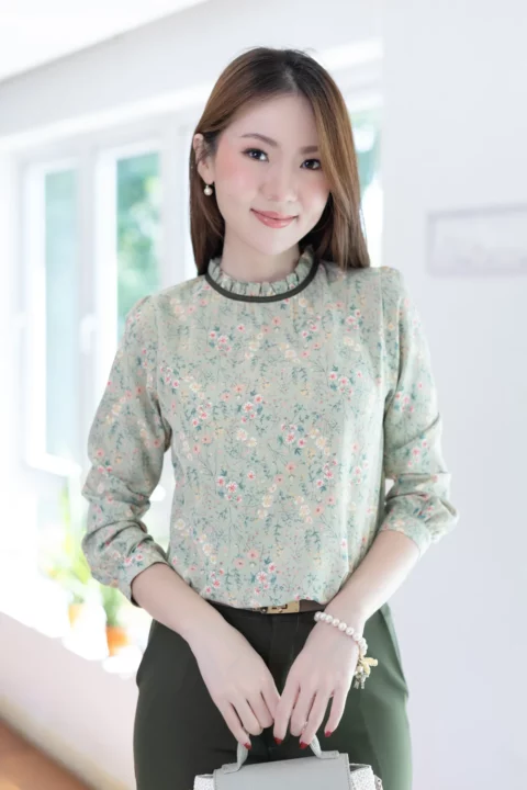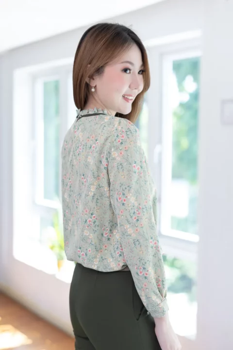 เสื้อแขนยาว คอจีบสวยทรงคุณค่า กุ๊นผ้าสีพื้นตัดรอบคอ หัวไหล่และปลายแขนจับจีบรูดเบาๆ ผ้าพิมพ์ลายดอกไม้สวยนุ่มนวล เพื่อการสวมใส่ที่สะดวกปลายแขนผ่าพร้อมติดกระดุมแบบคล้อง ด้านหลังคอผ่าหยดน้ำติดกระดุม