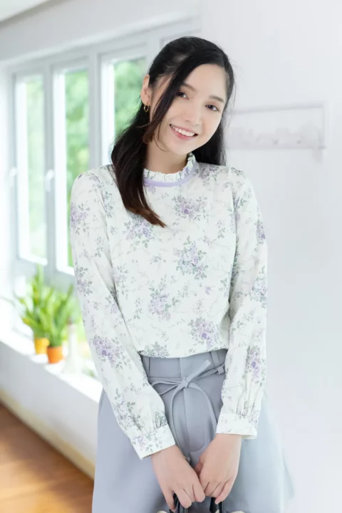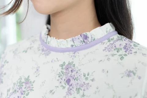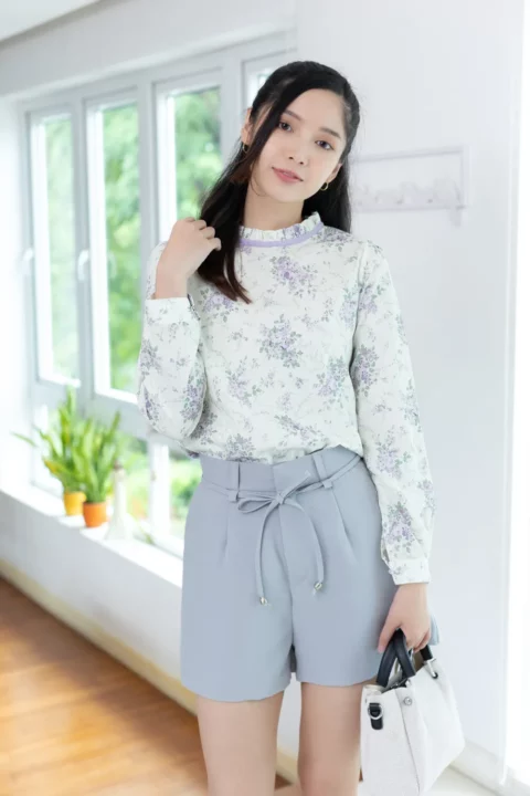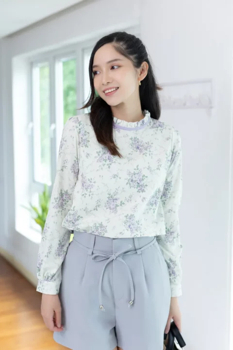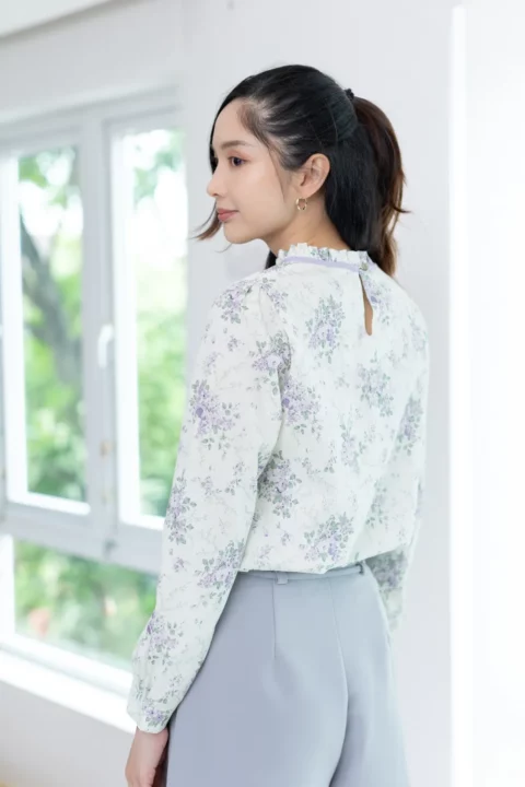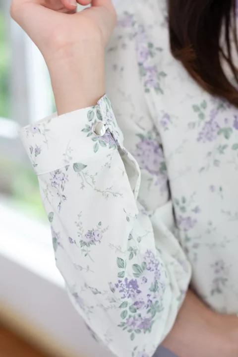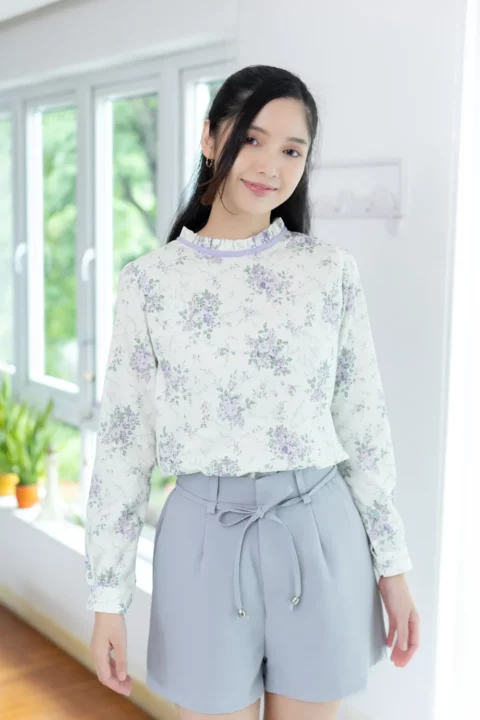 เสื้อแขนยาว คอจีบสวยทรงคุณค่า กุ๊นผ้าสีพื้นตัดรอบคอ หัวไหล่และปลายแขนจับจีบรูดเบาๆ ผ้าพิมพ์ลายดอกไม้สวยนุ่มนวล เพื่อการสวมใส่ที่สะดวกปลายแขนผ่าพร้อมติดกระดุมแบบคล้อง ด้านหลังคอผ่าหยดน้ำติดกระดุม