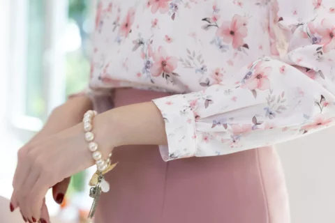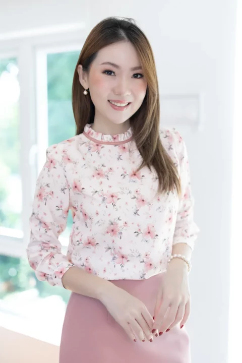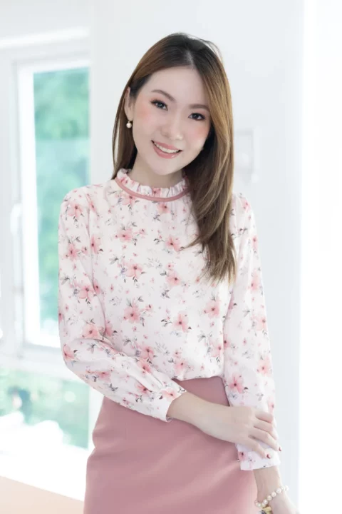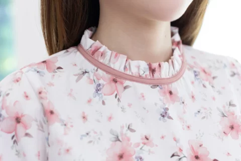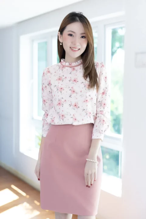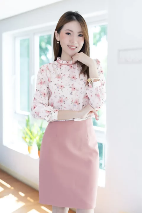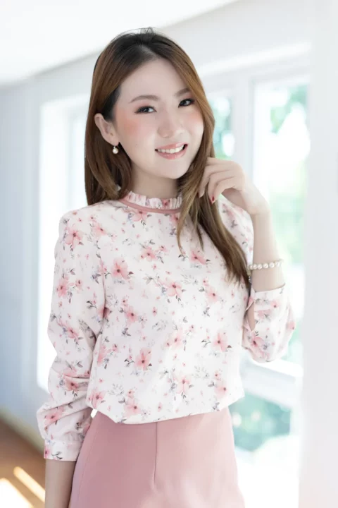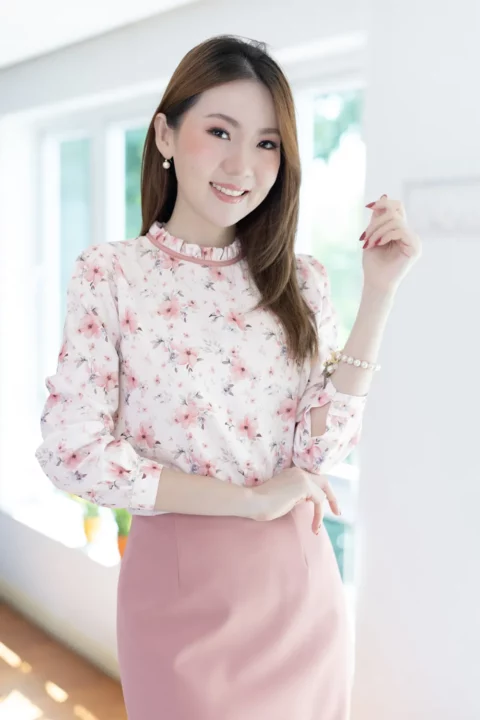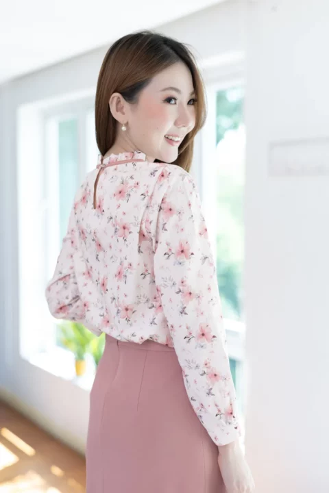 เสื้อแขนยาว คอจีบสวยทรงคุณค่า กุ๊นผ้าสีพื้นตัดรอบคอ หัวไหล่และปลายแขนจับจีบรูดเบาๆ ตัดเย็บด้วยเนื้อผ้าความบางใกล้เคียงไหมอิตาลี ตัวผ้ามีการอัดลายย่นจางๆเพิ่มความน่าสนใจ ผ้าพิมพ์ลายดอกไม้สวยนุ่มนวล เพื่อการสวมใส่ที่สะดวกปลายแขนผ่าพร้อมติดกระดุมแบบคล้อง ด้านหลังคอผ่าหยดน้ำติดกระดุม