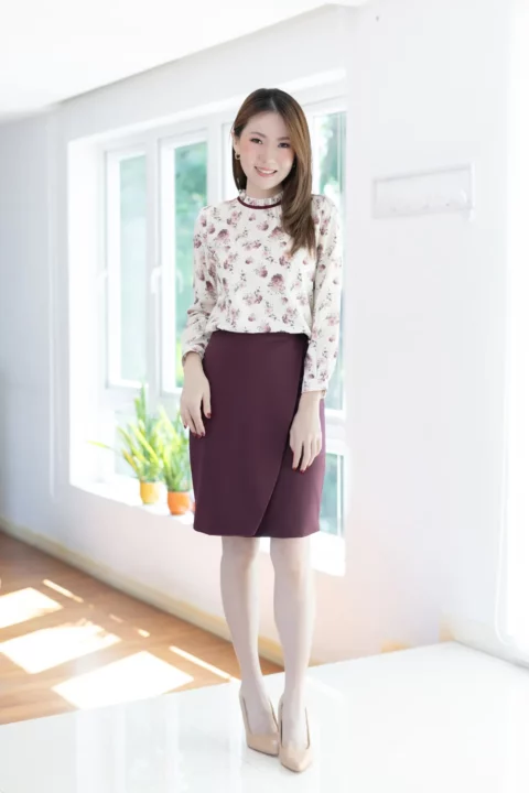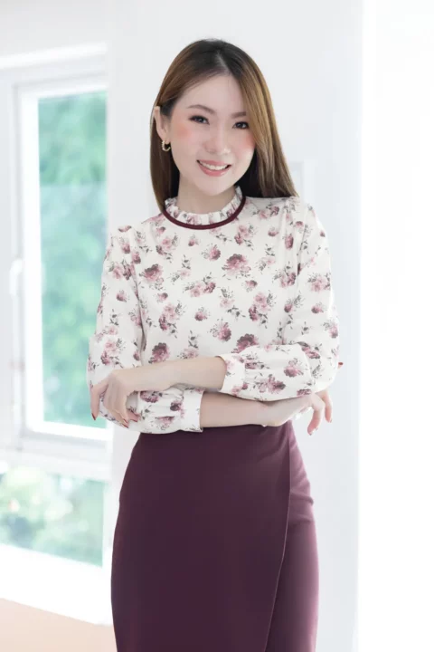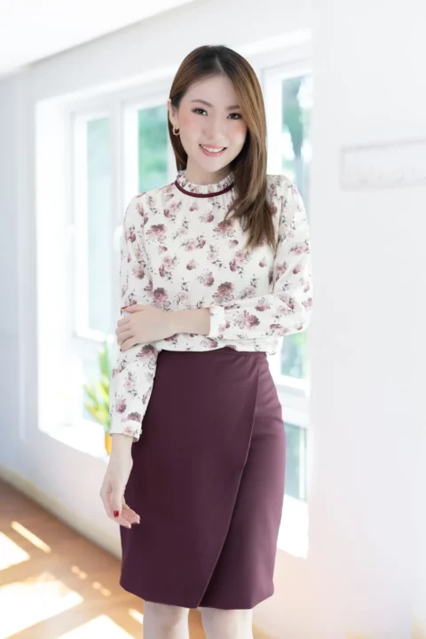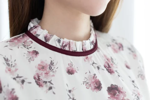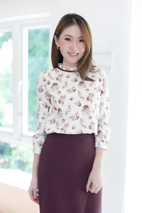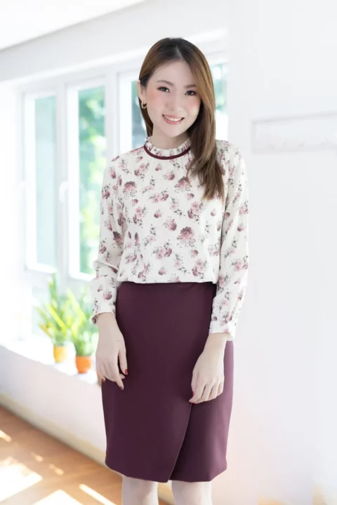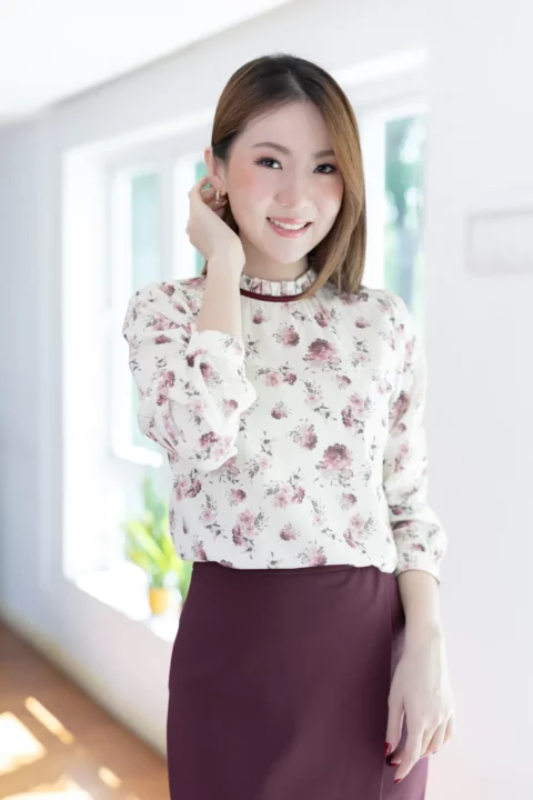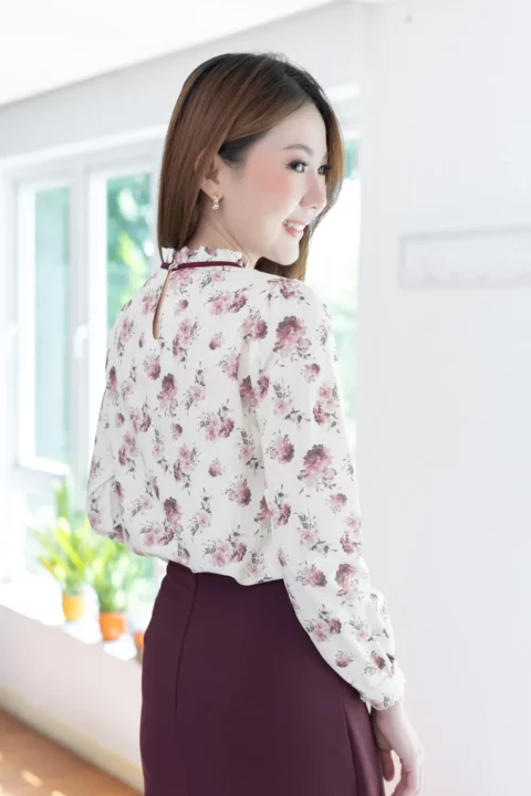 เสื้อคอจีบสวยทรงคุณค่า กุ๊นผ้าสีพื้นตัดรอบคอ หัวไหล่และปลายแขนจับจีบรูดเบาๆ ตัดเย็บด้วยเนื้อผ้าความบางใกล้เคียงไหมอิตาลี ตัวผ้ามีการอัดลายย่นจางๆเพิ่มความน่าสนใจ ผ้าพิมพ์ลายดอกกุหลาบ Elegant เพื่อการสวมใส่ที่สะดวกปลายแขนผ่าพร้อมติดกระดุมแบบคล้อง ด้านหลังคอผ่าหยดน้ำติดกระดุม