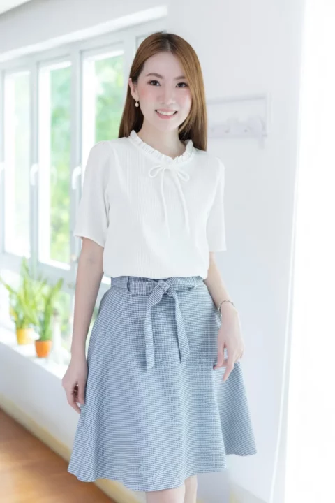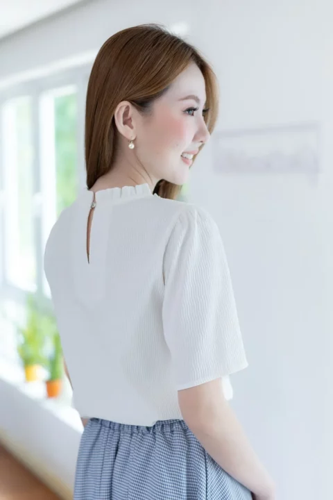 เสื้อคอจีบตั้ง แขนสั้น ผ้าเนื้อย่นริ้วแนวตั้ง ไม่หนามาก แมทช์ง่ายทั้งกระโปรงและกางเกงทรงสูง ดูเรียบร้อยแฝงความเก๋ ใส่ทำงานก็ได้ ใส่เที่ยวก็น่ารัก เรียบง่ายแต่มีดีเทล