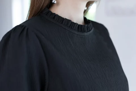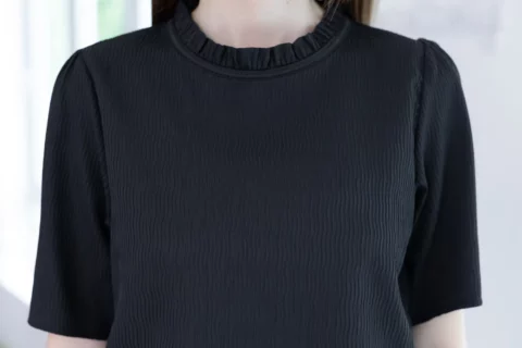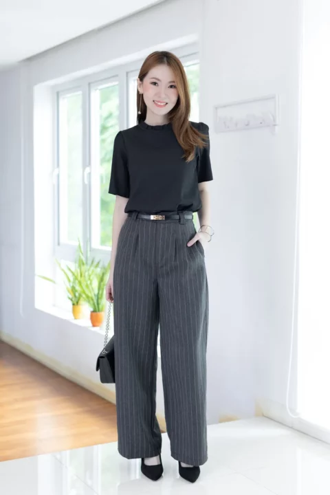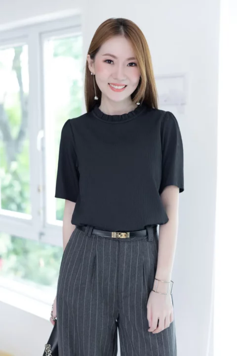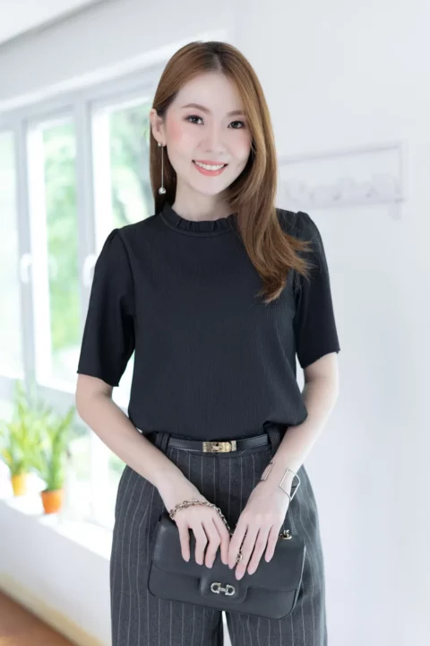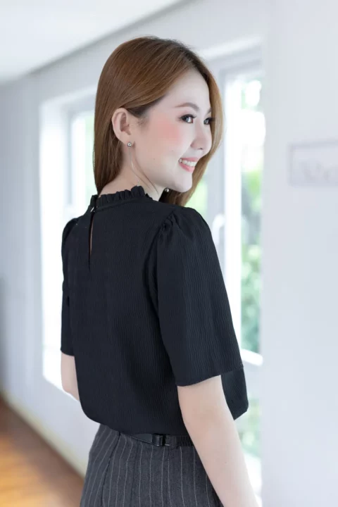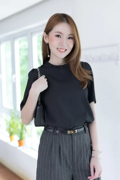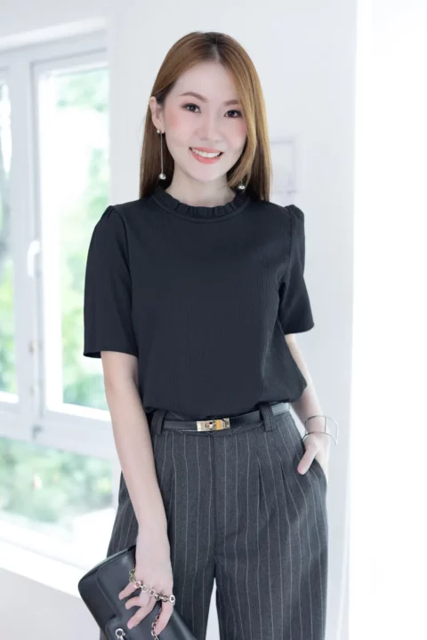 เสื้อคอจีบตั้ง แขนสั้น ผ้าเนื้อย่นริ้วแนวตั้ง ไม่หนามาก แมทช์ง่ายทั้งกระโปรงและกางเกงทรงสูง ดูเรียบร้อยแฝงความเก๋ ใส่ทำงานก็ได้ ใส่เที่ยวก็น่ารัก เรียบง่ายแต่มีดีเทล