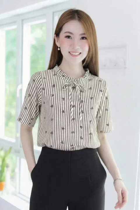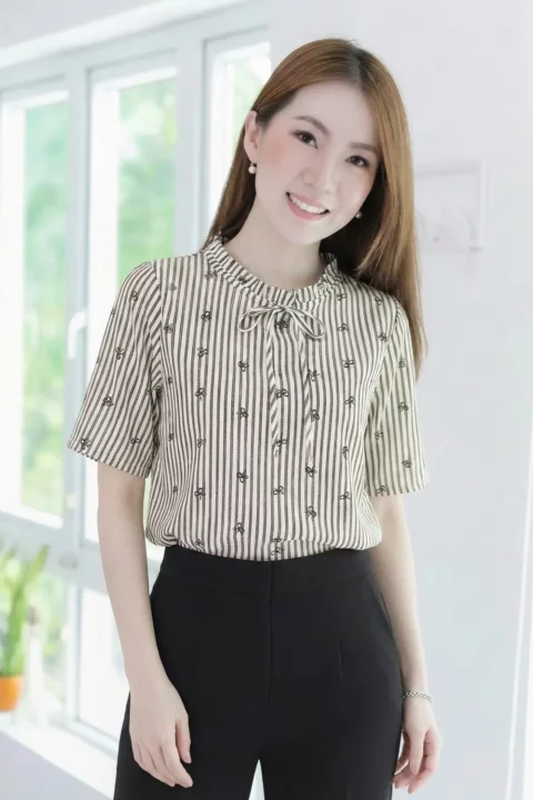 เสื้อคอจีบตั้ง แขนสั้น ผ้าลายริ้วย่นสลับเรียบ ไม่หนามาก พิมพ์ลายโบว์จิ๋วๆ แมทช์ง่ายทั้งกระโปรงและกางเกงทรงสูง ดูเรียบร้อยแฝงความเก๋ ใส่ทำงานก็ได้ ใส่เที่ยวก็น่ารัก เรียบง่ายแต่มีดีเทล
