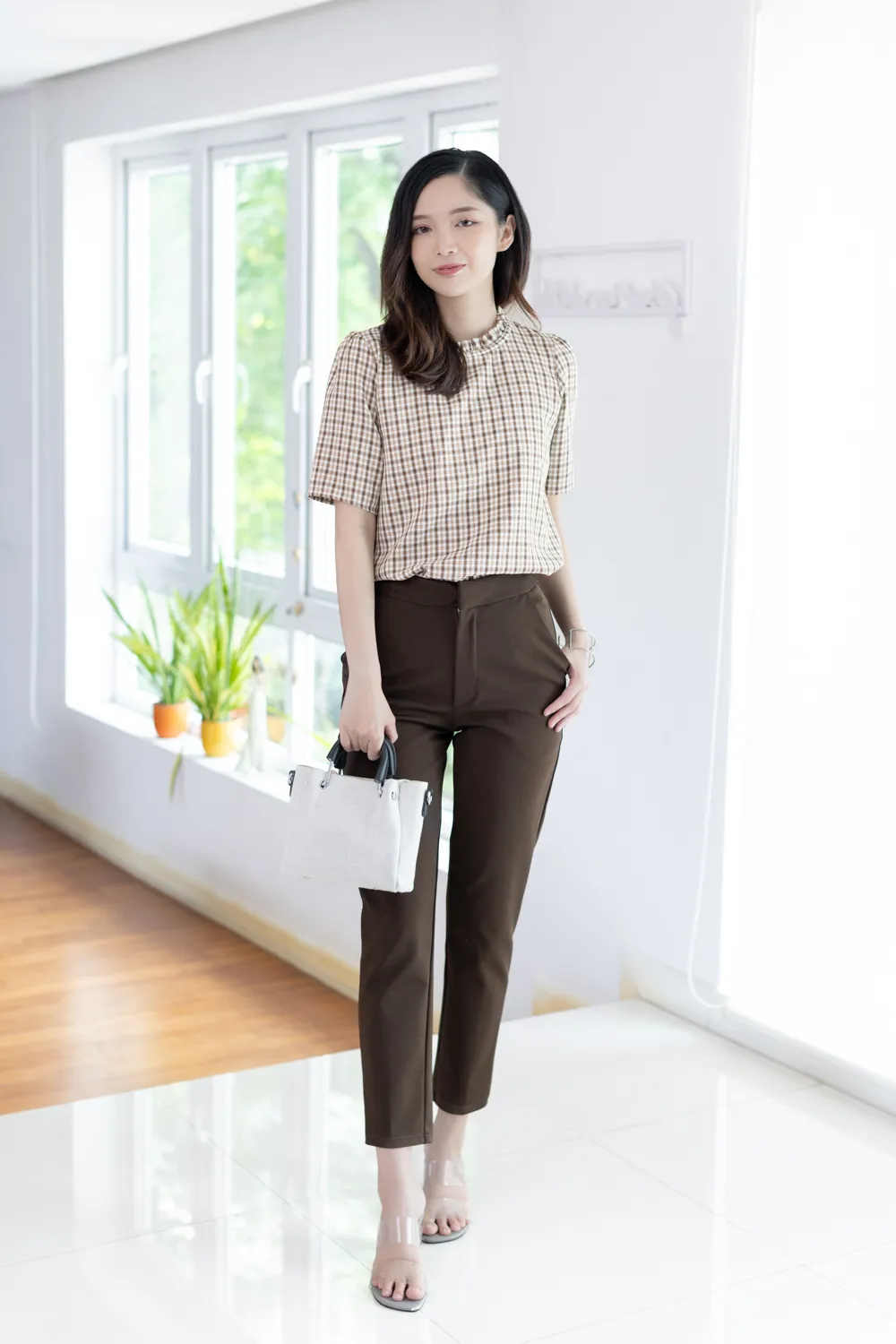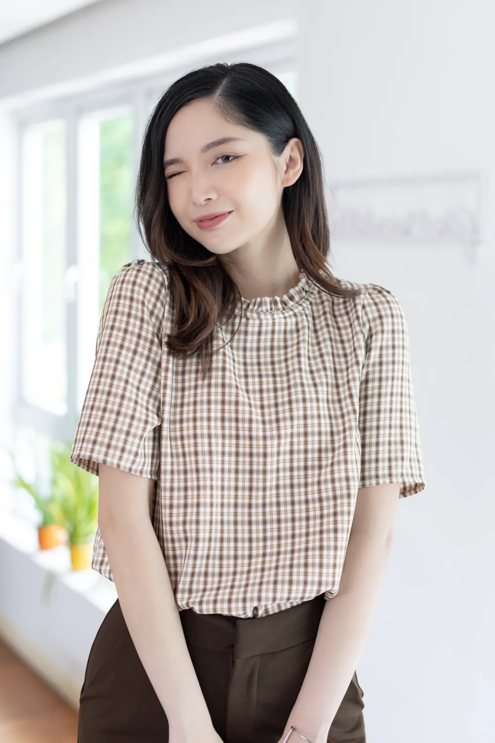 เสื้อคอจีบตั้ง แขนสั้น ตัดเย็บด้วยเนื้อโพลีเอสเตอร์ผสมทอลายตาราง แมทช์ง่ายทั้งกระโปรงและกางเกงทรงสูง ดูเรียบร้อยแฝงความเก๋ ใส่ทำงานก็ได้ ใส่เที่ยวก็น่ารัก เรียบง่ายแต่มีดีเทล
