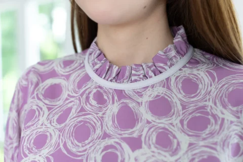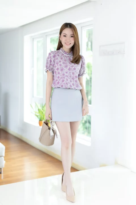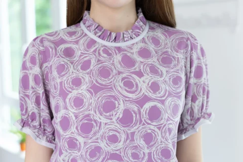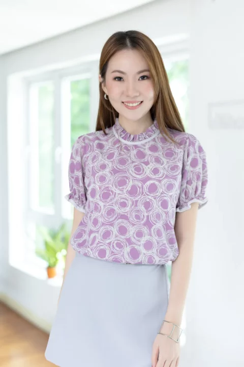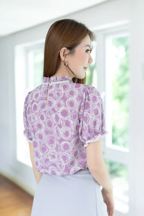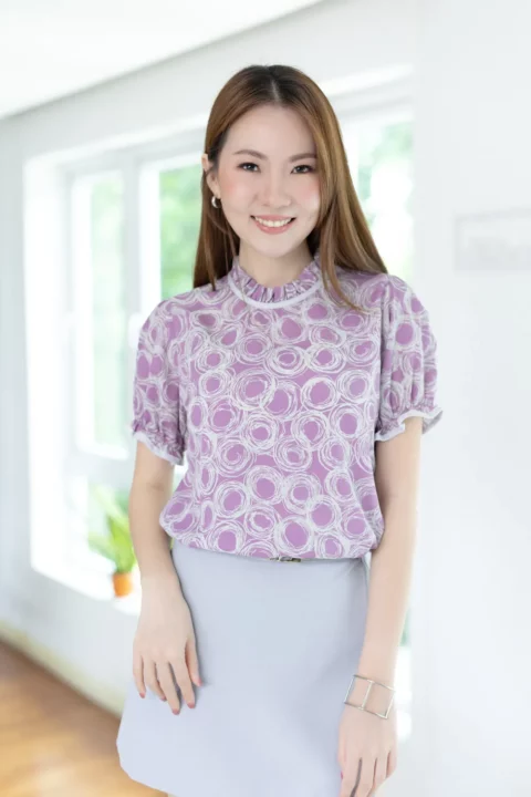 เสื้อคอจีบสวยหวาน แต่งกุ๊นผ้าสีพื้น แขนตุ๊กตา ช่วงปลายแขนจับจีบยางยืด ผ้าพิมพ์ลายกราฟิกสวยเก๋ ด้านหลังคอผ่าหยดน้ำติดกระดุมสวมใส่ง่าย