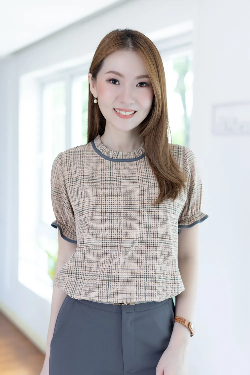 เสื้อคอจีบสวยหวาน แต่งกุ๊นผ้าสีพื้น แขนตุ๊กตา ช่วงปลายแขนจับจีบยางยืด ผ้าพิมพ์ลายตารางสวยนุ่มนวล ด้านหลังคอผ่าหยดน้ำติดกระดุมสวมใส่ง่าย