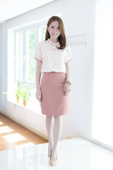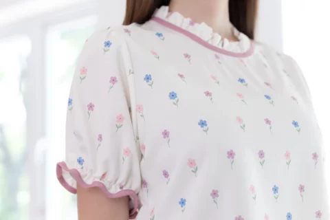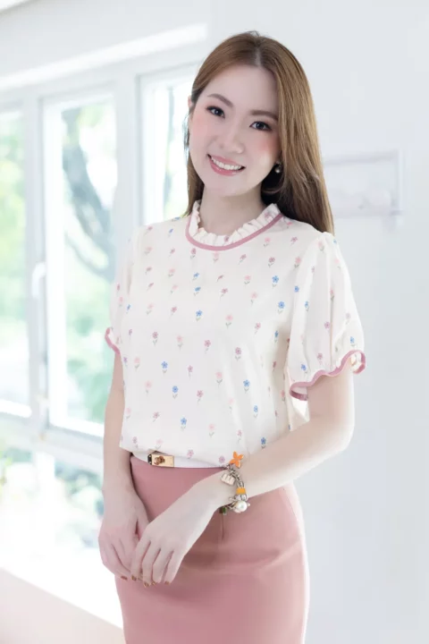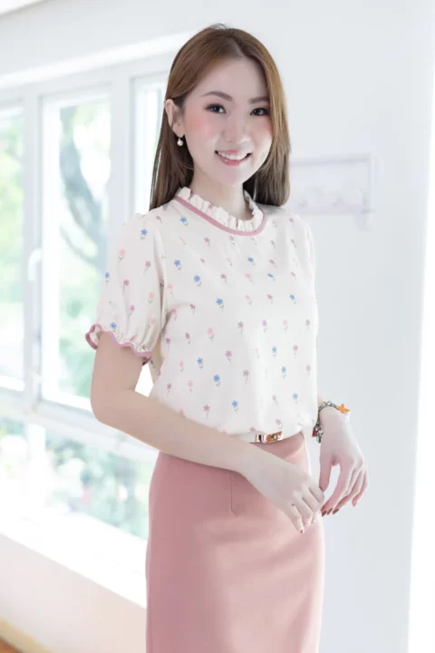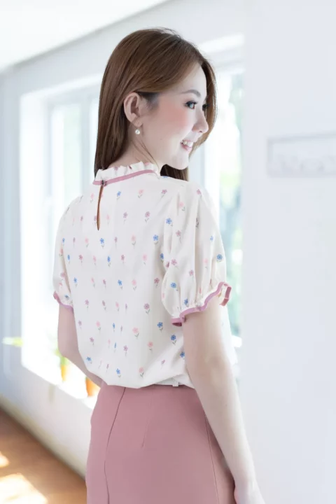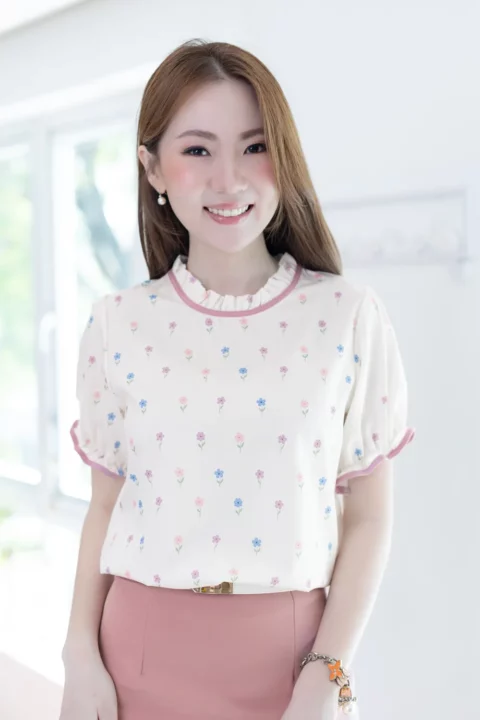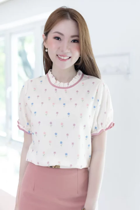 เสื้อคอจีบสวยหวาน แต่งกุ๊นผ้าสีพื้น แขนตุ๊กตา ช่วงปลายแขนจับจีบยางยืด ผ้าพิมพ์ลายดอกไม้จิ๋วๆสวยนุ่มนวล ด้านหลังคอผ่าหยดน้ำติดกระดุมสวมใส่ง่าย
