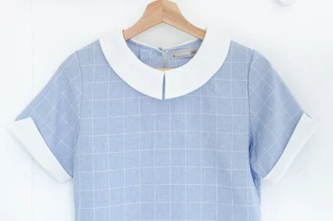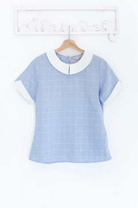 เสื้อปกบัวแหลม แขนเก๋! แต่งขอบทรงบากด้านข้าง สวยสุภาพกำลังดี ตัดเย็บด้วยเนื้อคอตตอนผสมโพลีเอสเตอร์ Texture สวย ทอลายตาราง สวยแบบคลีนๆ เนื้อไม่หนาไม่บาง ด้านหลังผ่าหยดน้ำติดกระดุม