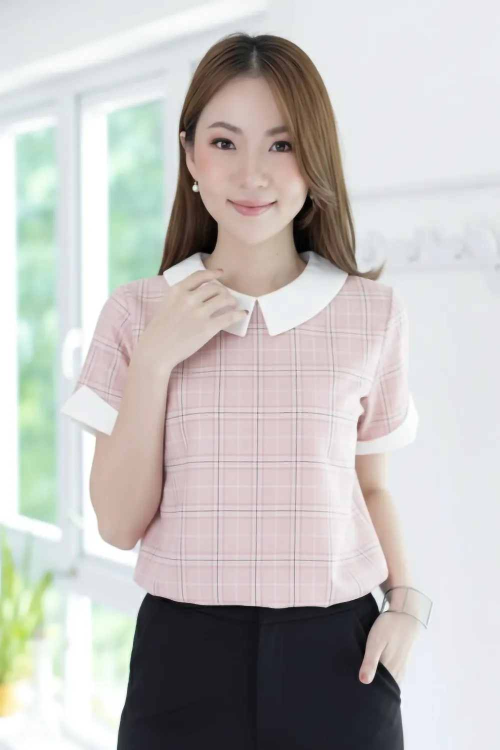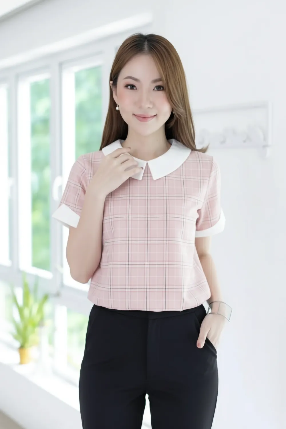 เสื้อปกบัวแหลม แขนเก๋! แต่งขอบทรงบากด้านข้าง สวยสุภาพกำลังดี ตัดเย็บด้วยเนื้อคอตตอนผสมโพลีเอสเตอร์ Texture สวย ทอลายตาราง สวยแบบคลีนๆ เนื้อไม่หนาไม่บาง ด้านหลังผ่าหยดน้ำติดกระดุม